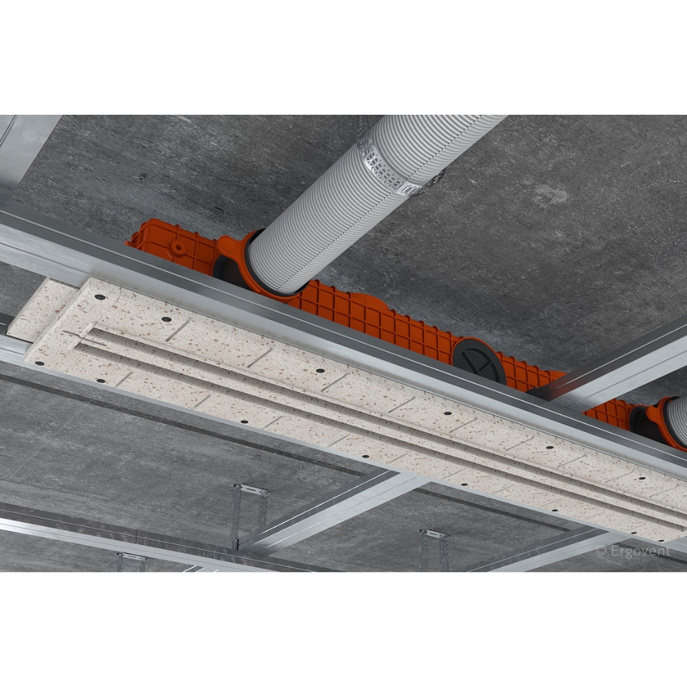 Din punct de vedere constructiv, partea inferioară a difuzorului, aflată în contact cu placa de gips-carton, este realizată din material rigid reciclat, cu proprietăți apropiate de cele ale ipsosului în ceea ce privește dilatarea și absorbția. Astfel, după fixare, difuzorul, placa și profilele plafonului lucrează ca un ansamblu unitar, reducând riscul apariției fisurilor în zona de finisaj în timpul exploatării pe termen lung. După instalare, zona se gletuiește și se vopsește în aceeași culoare cu plafonul sau peretele, pentru un rezultat estetic uniform.