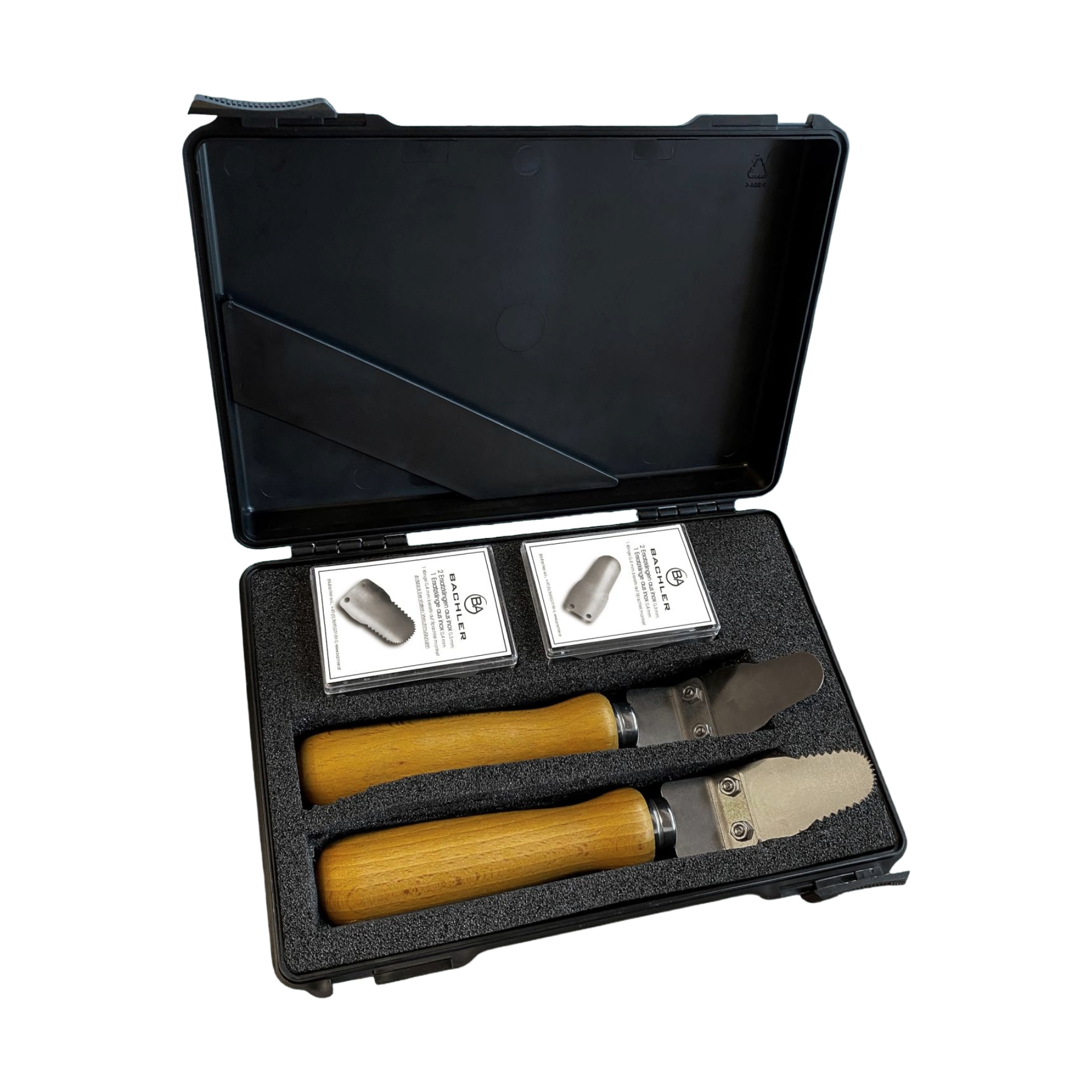 BACHLER - Set de spatule pentru curățarea schimbătoarelor de căldură din inox, în valiză este conceput pentru lucrări de service și mentenanță asupra schimbătoarelor de căldură din inox, unde este necesară îndepărtarea controlată a depunerilor din camera de ardere și de pe suprafețele schimbătorului. Setul include două spatule cu mâner robust din lemn: o spatulă tip gheară pentru murdărie puternică și depuneri persistente, respectiv o spatulă cu lamă rotunjită pentru depuneri standard. Lamele sunt realizate din inox V2A, cu grosime de 0,4 mm, și sunt completate de lame de rezervă pentru fiecare tip de spatulă. Configurația este livrată într-o valiză cu inserție din spumă, pentru protecția accesoriilor și utilizare organizată în intervenții de teren.