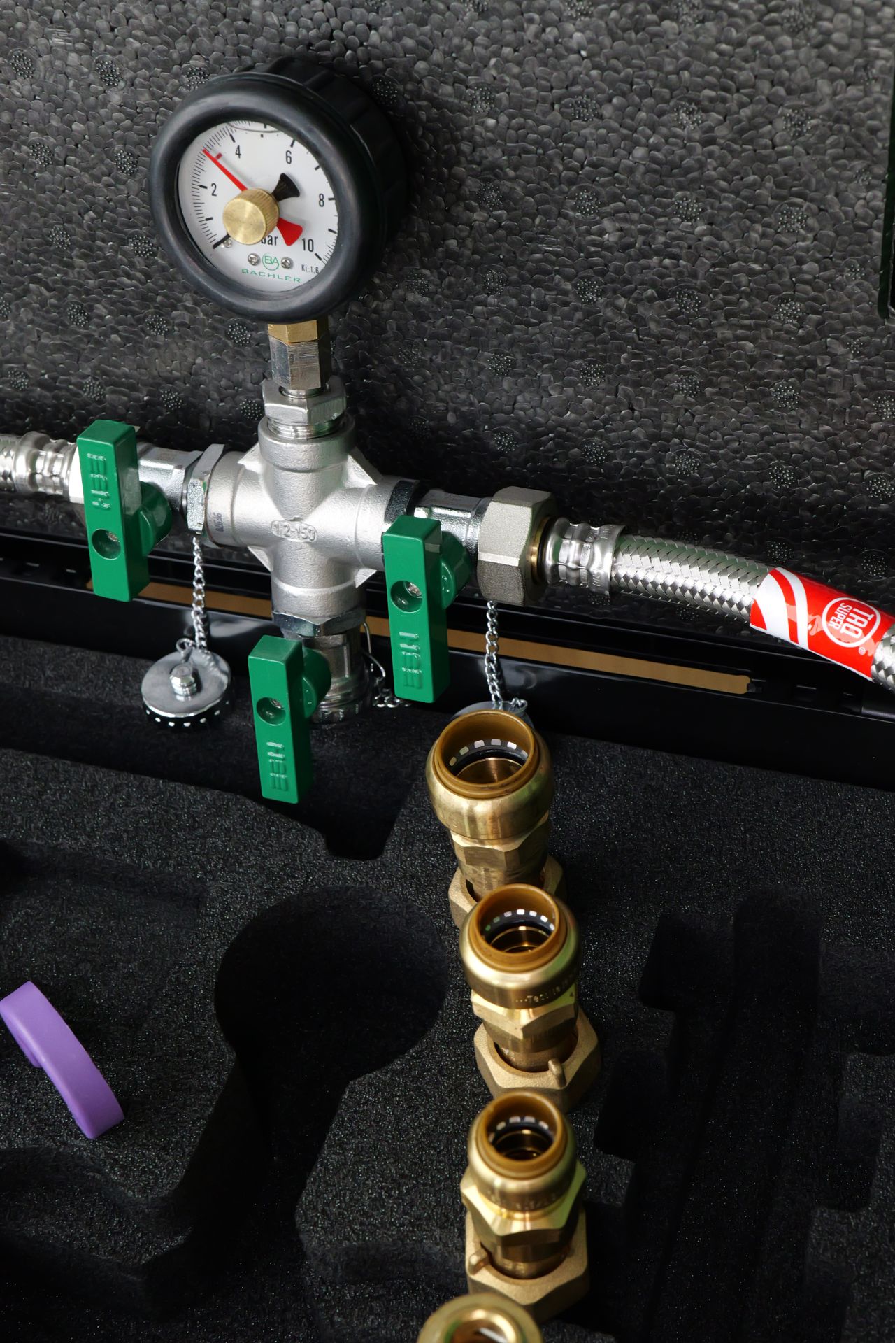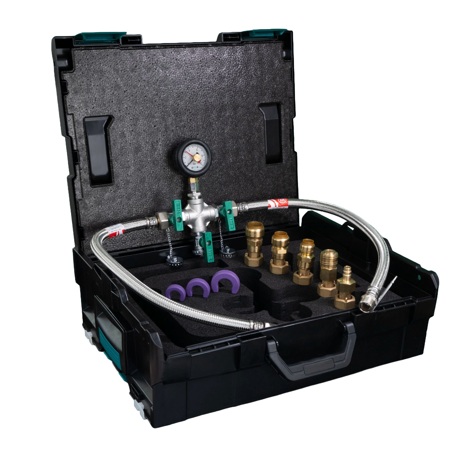 BACHLER - Set profesional pentru probarea la presiune a instalațiilor de încălzire și sanitare, în L-BOXX este conceput pentru verificarea etanșeității și testarea la presiune a circuitelor hidraulice în lucrări de montaj, service și punere în funcțiune. Configurația setului permite realizarea probelor atât cu apă, cât și cu aer comprimat, până la presiunea maximă de 10 bar. Unitatea de bază este realizată din inox și este echipată cu manometru cu glicerină, protejat cu carcasă din cauciuc, pentru citire stabilă și utilizare în condiții de șantier. Setul include furtunuri armate, adaptoare pentru țevi din cupru și inox, precum și accesorii pentru conectare rapidă și demontare controlată. Toate conexiunile sunt preasamblate cu piuliță de 3/4", pregătite pentru racordare cu etanșare plană.