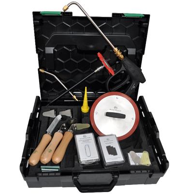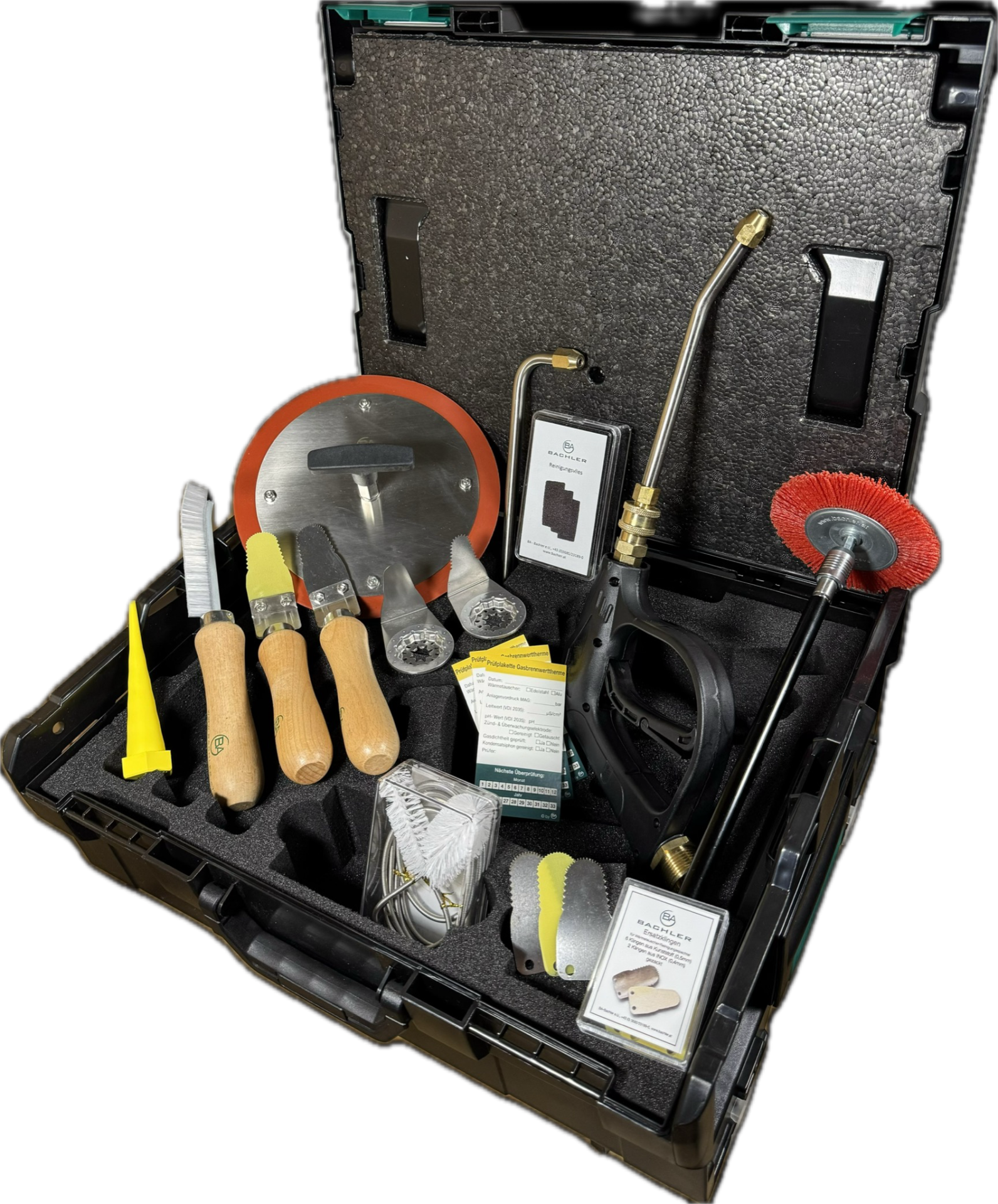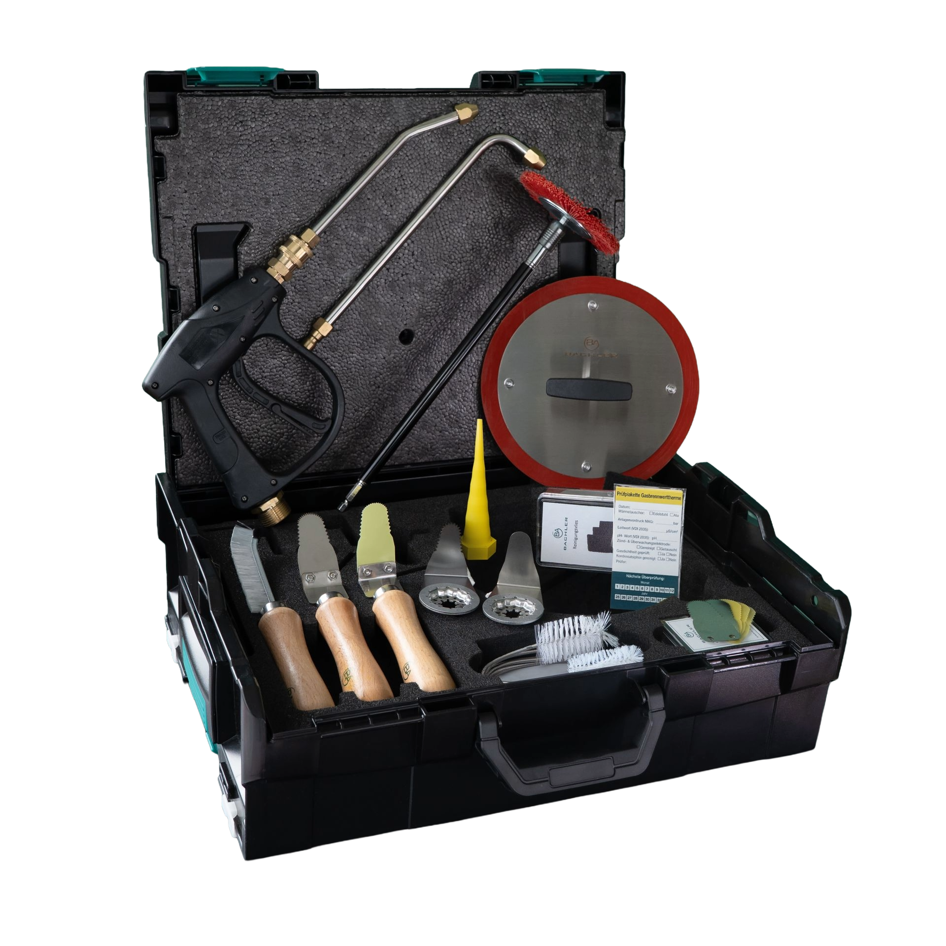 BACHLER - Set universal pentru curățarea schimbătoarelor de căldură, în L-BOXX este conceput pentru lucrări profesionale de service și întreținere asupra schimbătoarelor de căldură utilizate în centrale termice în condensație și echipamente HVAC. Configurația setului include accesorii pentru îndepărtarea depunerilor standard și persistente, curățarea spațiilor înguste ale schimbătorului, clătirea controlată cu apă și protejarea zonelor sensibile la umiditate în timpul spălării. Lamele Starlock și spatulele metalice sunt destinate utilizării pe schimbătoare de căldură din inox, iar spatula cu lamă zimțată din plastic și peria disc din nylon pot fi utilizate și pentru aplicații unde este necesară o curățare mai puțin agresivă, inclusiv pe aluminiu, cu atenția tehnică corespunzătoare. Setul include și accesorii auxiliare pentru închiderea temporară a conductei de gaz, curățarea sifonului de condens și marcarea următoarei verificări. Organizarea în valiză L-BOXX asigură depozitarea ordonată și transportul sigur al uneltelor în intervenții de teren.
