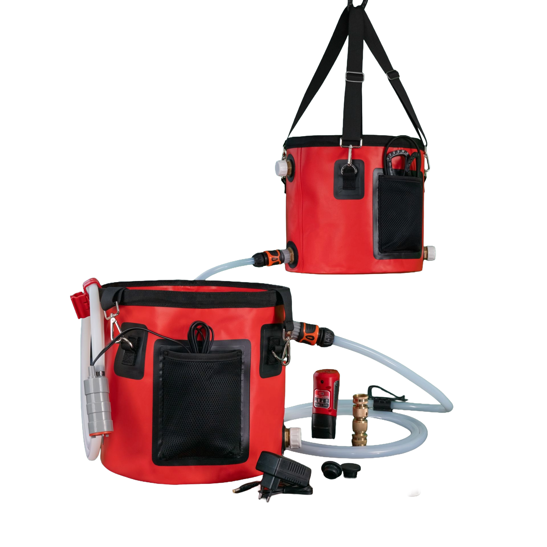 BACHLER - Sistem modular X-BUCKET connect Duo 40 L pentru colectare, evacuare și pompare lichide este conceput pentru echipele de service care au nevoie de o soluție flexibilă pentru intervenții în unul sau mai multe puncte de lucru simultan. Configurația cu două recipiente de câte 20 litri permite organizarea eficientă a colectării și evacuării apei sau a altor lichide în timpul lucrărilor de întreținere, reparație și golire locală. Recipientele sunt modelabile, dublu ranforsate și prevăzute cu adaptoare de conectare, racord integrat de 3/4" și dopuri de închidere interioare și exterioare. Sistemul include pompă submersibilă externă de 12 V, cu filtru fin, debit maxim de 10 l/min și temperatură maximă de utilizare 60°C, precum și acumulator dedicat pentru funcționare mobilă. Ansamblul este completat cu furtunuri din silicon, adaptoare de evacuare, elemente de prindere și suport magnetic, ceea ce îl recomandă pentru intervenții profesionale în instalații HVAC, sanitare și tehnice unde este necesară colectarea și pomparea controlată a lichidului.