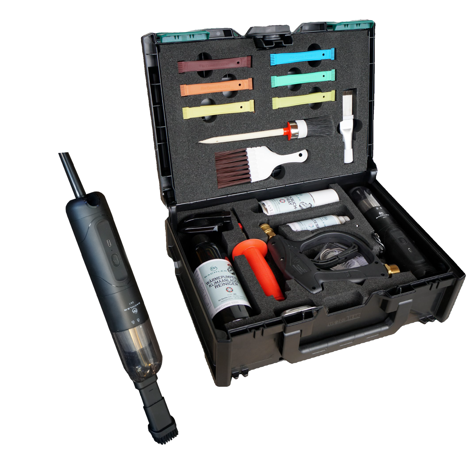Trusă profesională pentru curățarea și mentenanța pompelor de căldură și a aparatelor de aer condiționat PREMIUM este concepută pentru lucrări de curățare și service la pompe de căldură aer-apă și sisteme de climatizare. Trusa reunește instrumente și consumabile utile pentru intervenții de mentenanță asupra bateriilor cu lamele, a zonelor expuse la depuneri și condens și a componentelor care necesită întreținere periodică. Configurația este organizată în valiză metaBOX 145S cu inserție din spumă, ceea ce permite depozitarea ordonată, protecția accesoriilor și utilizarea practică în intervenții de teren.