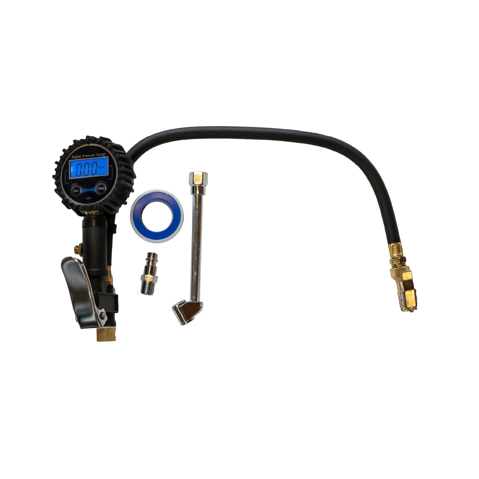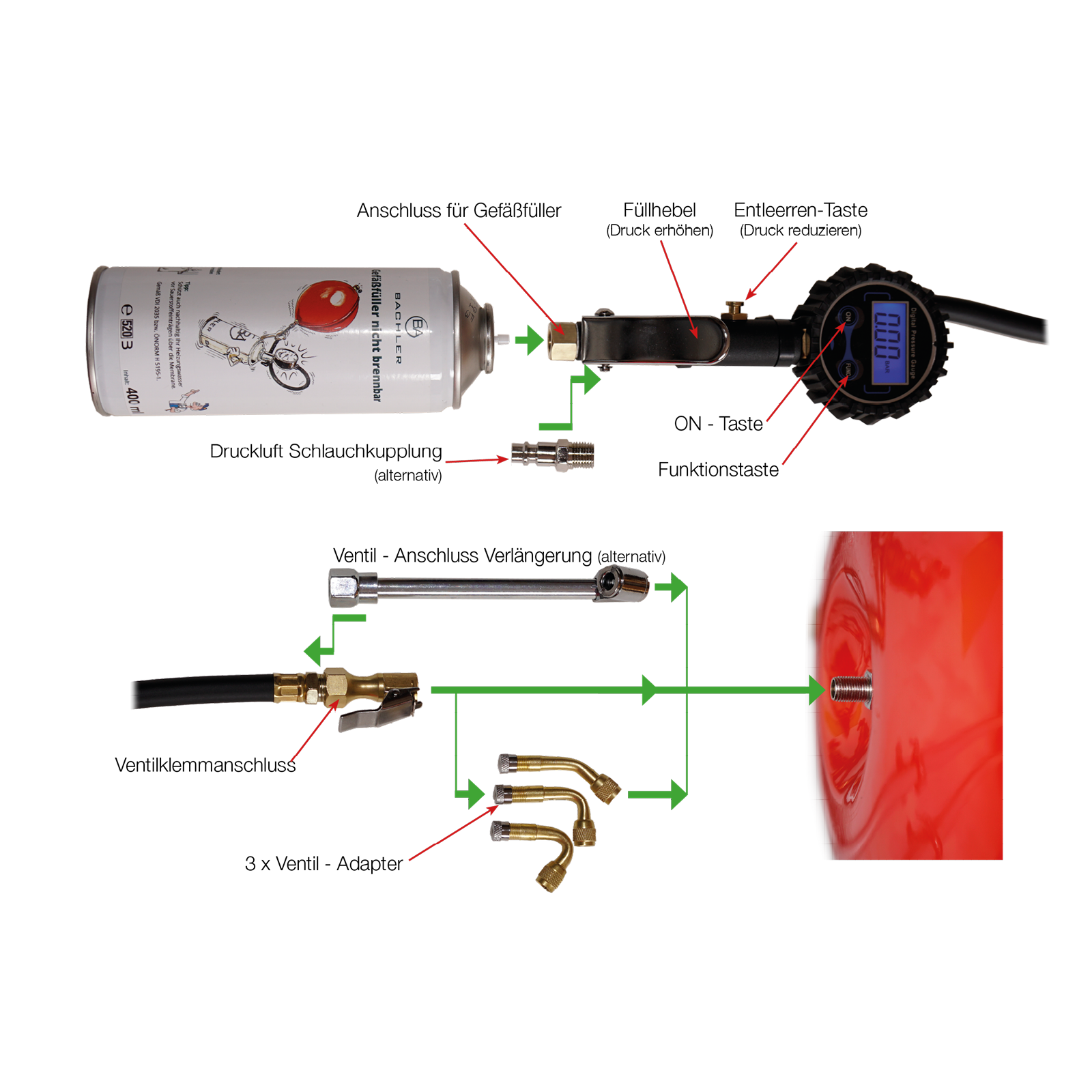 - Manometru cu afișaj digital, cu clemă de racordare pe ventil pentru vasul de expansiune cu membrană și conexiune pentru doză de umplere;
