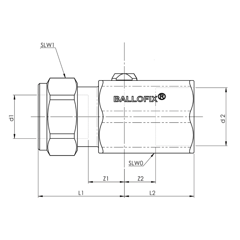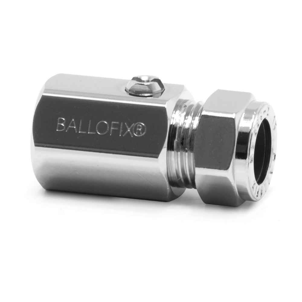 Robinetul mini cu bilă Broen Ballofix fără mâner, cu o conexiune de tip compresiune și una filet interior, este proiectat pentru aplicații în instalații de apă potabilă, aer comprimat, încălzire și răcire. Construcție robustă din alamă CW625N DZR, etanșare EPDM și finisaj cromat. Se poate acționa cu șurubelniță sau cu mânere colorate Ballofix pentru identificare rapidă. Presiune nominală: 10 bar. Temperatură de lucru: -20°C…+120°C. Filet G – BSPP, conexiune compresiune standard.