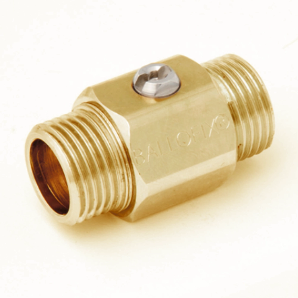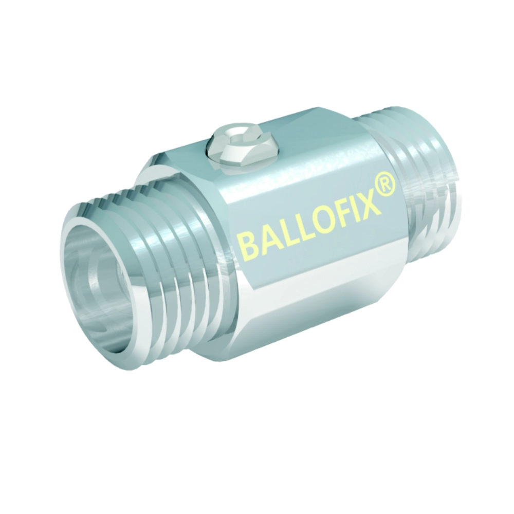 Robinetul mini cu bilă Broen Ballofix fără mâner, cu două conexiuni filet exterior, este destinat aplicațiilor profesionale de apă potabilă, aer comprimat, încălzire și răcire. Este realizat din alamă CW625N (DZR), cu etanșare EPDM și finisaj cromat sau alamă. Poate fi acționat cu o șurubelniță sau cu mâner Ballofix, disponibil în culori pentru identificare ușoară.