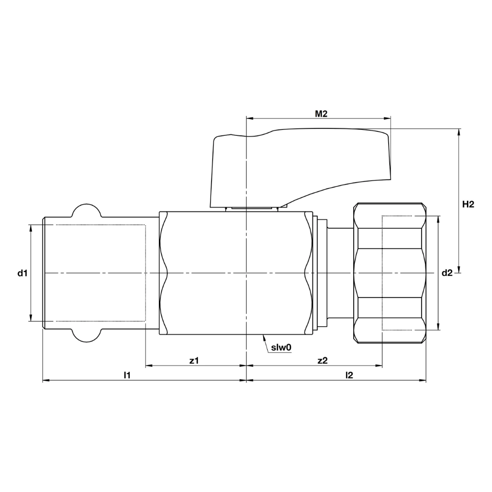 Robinetul mini cu bilă Broen Ballofix, cu mâner, cu conexiuni presare x piuliță olandeză, este ideal pentru instalații de apă potabilă, aer comprimat, încălzire și răcire. Fabricat din alamă CW625N (DZR), cu etanșare EPDM și finisaj cromat cu mâner black.