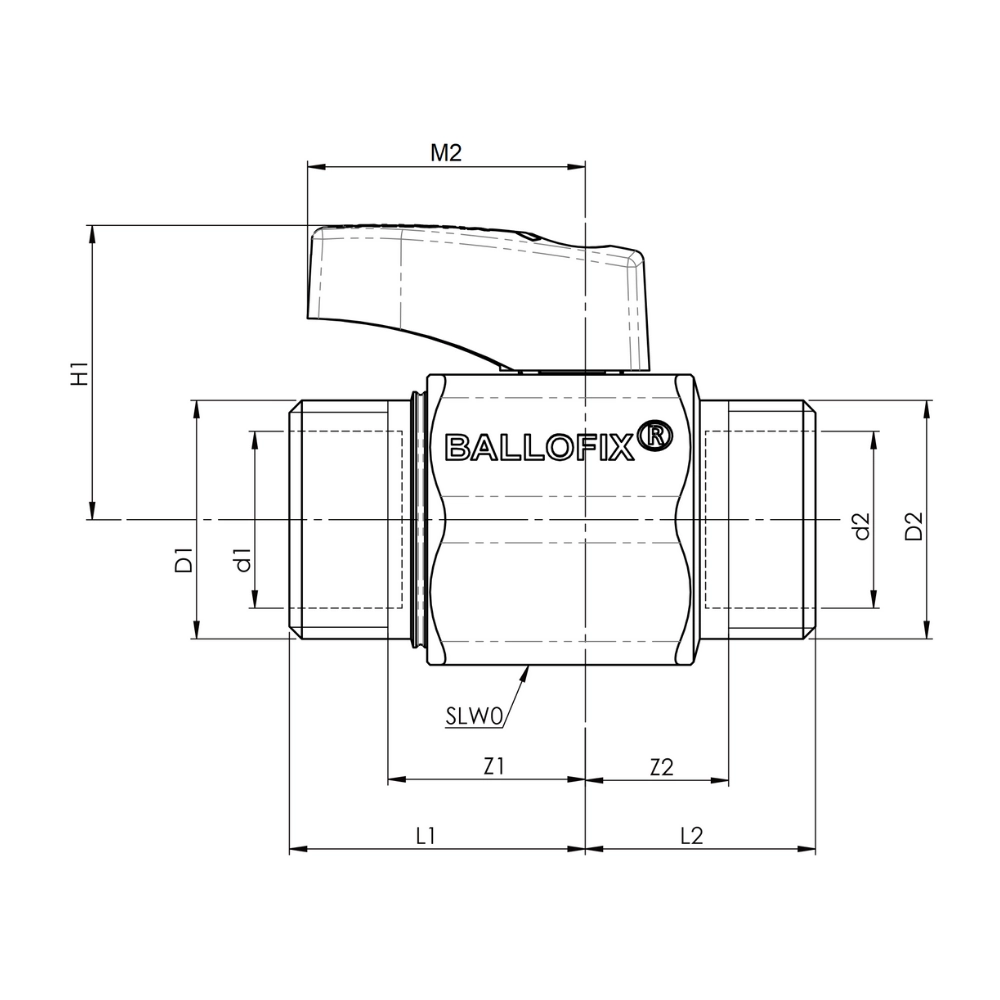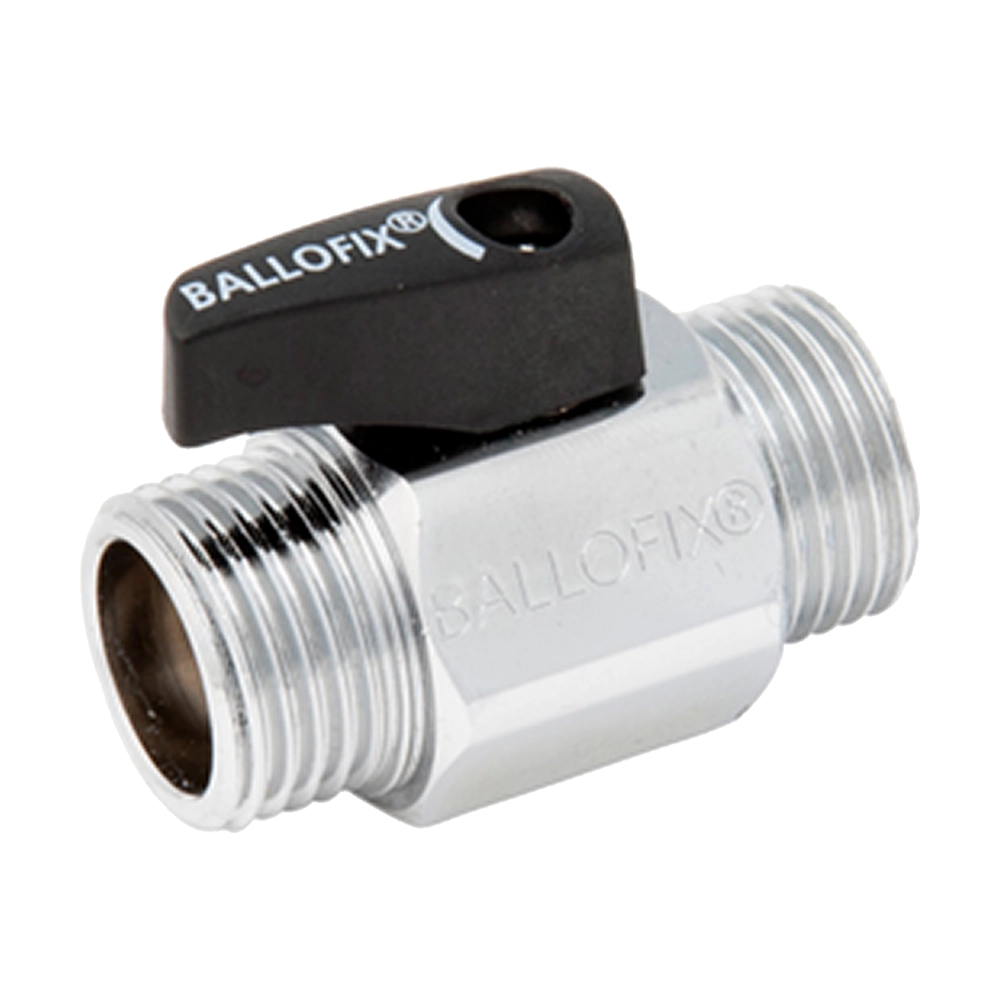 Broen Ballofix mini ball valve cu mâner, cu două conexiuni filet exterior (BSPP), este proiectat pentru aplicații în instalații de apă potabilă, răcire și aer comprimat. Construit din alamă CW625N (DZR), cu etanșare EPDM și finisaj cromat, echipat cu mâner Ballofix negru. Presiune nominală 10 bar. Temperatura de lucru: -20°C…+120°C. Montaj drept (0°). Diametru nominal: DN20 (G3/4"). Dimensiuni: V=14 mm, A=90 mm.