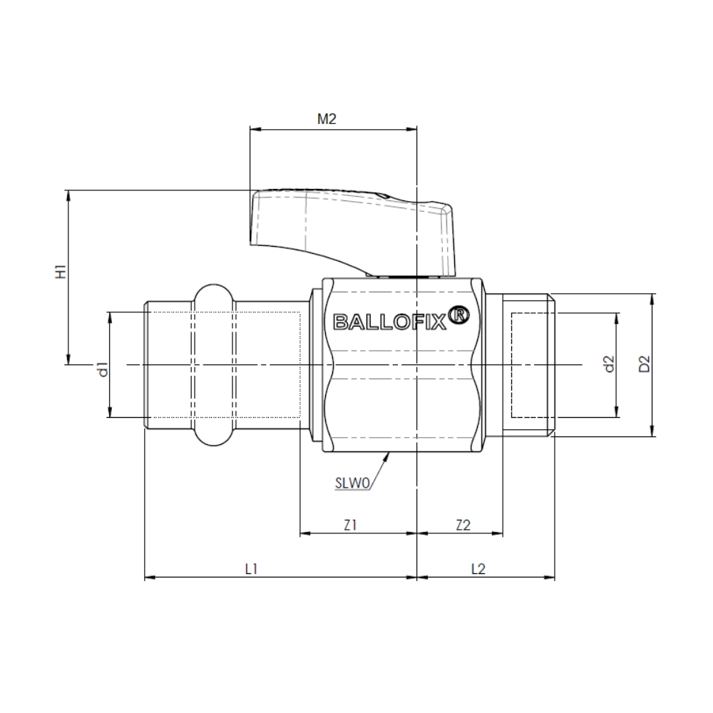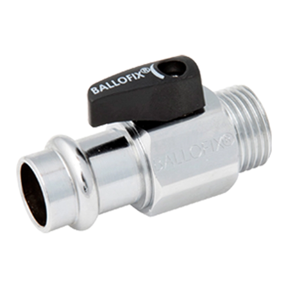Robinet mini cu bilă Broen Ballofix cu mâner, cu conexiuni presare x filet exterior, ideal pentru apă potabilă, aer comprimat, încălzire și răcire. Alamă CW625N DZR, EPDM, finisaj cromat cu mâner black. Presiune: 10 bar. Temperatură: -20°C…+120°C.