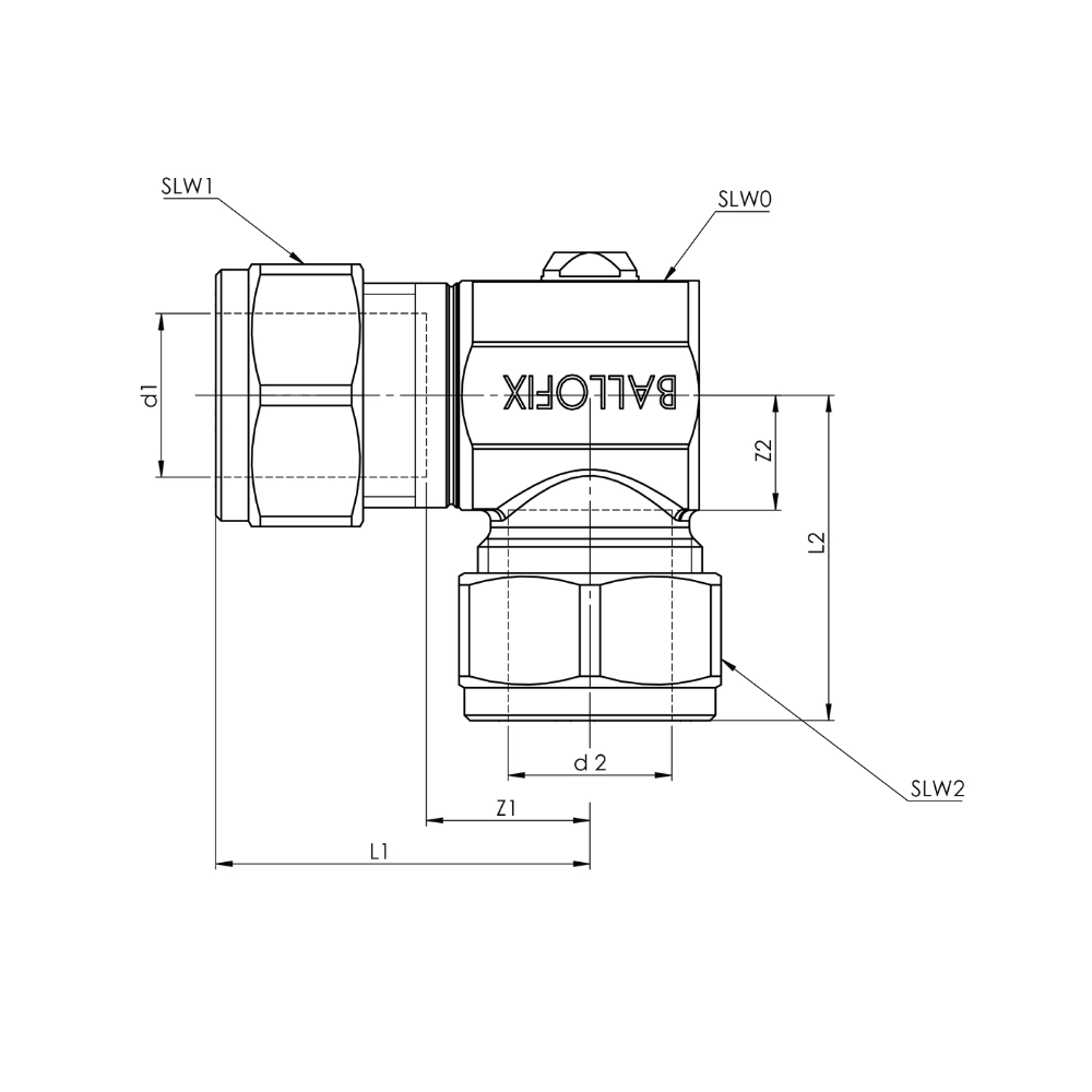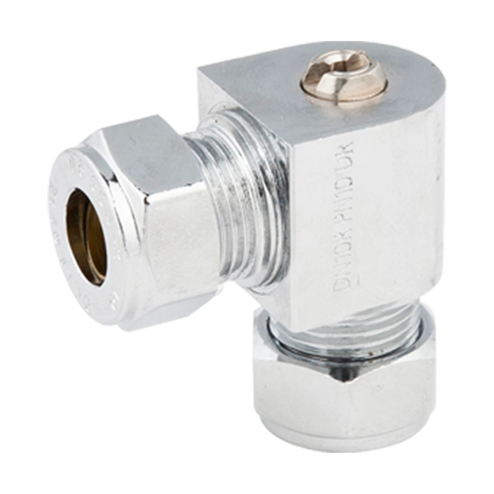 Robinet unghiular (90°) mini cu bilă Broen Ballofix, fără mâner, cu conexiuni duble compresiune, ideal pentru instalații de apă potabilă, aer comprimat, încălzire și răcire. Construcție din alamă CW625N DZR, etanșare EPDM și finisaj cromat. Presiune nominală: 10 bar. Temperatură de lucru: -20°C…+120°C.