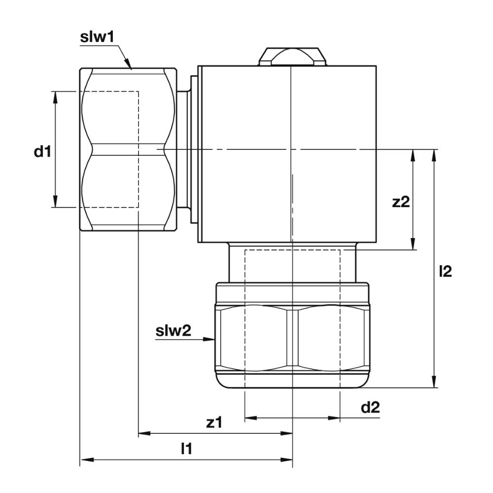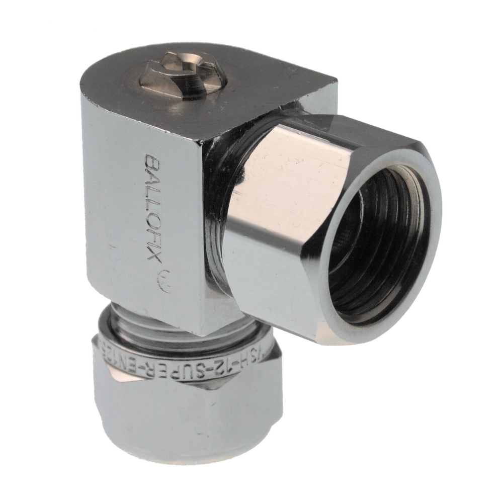 Broen Ballofix mini ball valve unghiular 90° fără mâner, cu conexiuni compresiune x piuliță olandeză, ideal pentru instalații de apă potabilă. Fabricat din alamă CW625N (DZR) cu etanșare EPDM și finisaj cromat. Presiune nominală: 10 bar. Temperatura de lucru: -20°C…+120°C. Dimensiuni: 40×42×24 mm.