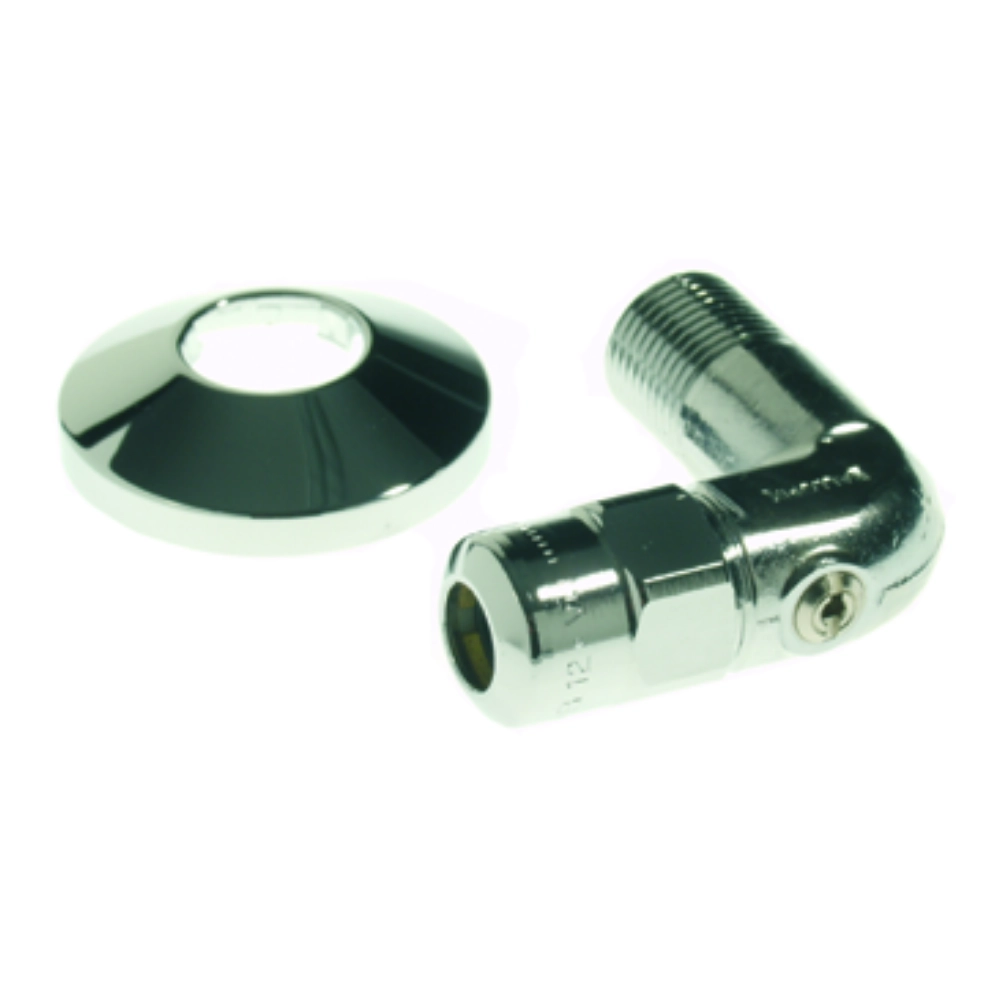Broen Ballofix mini ball valve unghiular (90°) fără mâner, cu filet exterior (BSPP) și compresiune, ideal pentru instalații de apă potabilă în clădiri comerciale. Construcție din alamă CW614N/DZR, etanșare EPDM, finisaj cromat fără mâner.