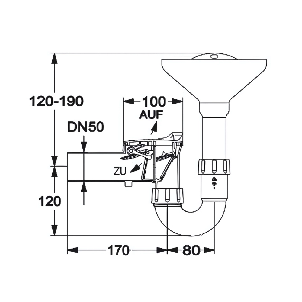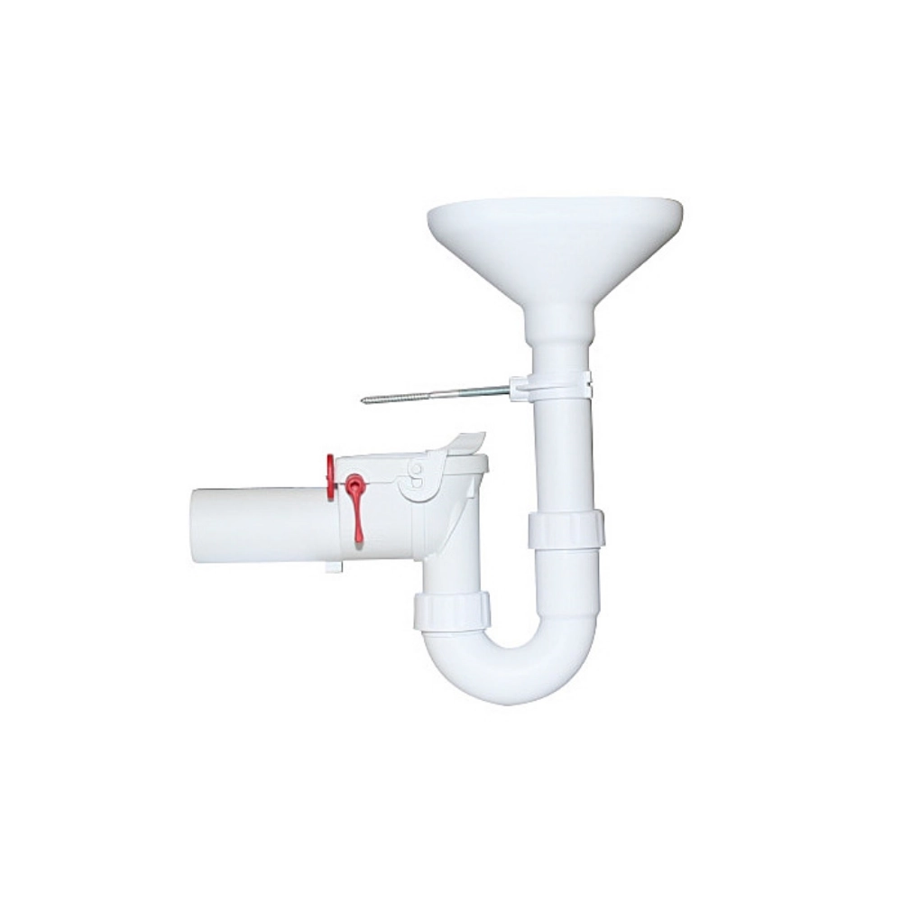 Barieră anti-refulare pentru DN 50 cu sifon tip pâlnie, realizată din polipropilenă, destinată colectării apelor de preaplin sau condens. Integrează două clapete autorevenire și o clapetă de siguranță acționată manual, blocabilă, pentru protecție suplimentară împotriva refluxului. Pâlnia de admisie facilitează conectarea scurgerilor libere, iar p-trap-ul 1½" asigură funcționarea corectă a sifonului.