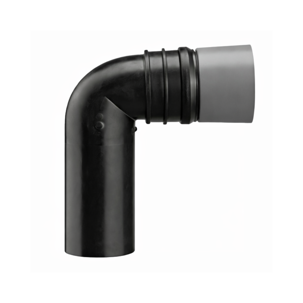 Cot de racordare perete-perete la 90°, destinat instalațiilor de evacuare, realizat din polietilenă de înaltă densitate (PE-HD) cu posibilitate de sudare sau de introducere în altă conductă de scurgere. Execuția este prevăzută cu garnitură dublă de etanșare, care asigură o îmbinare sigură și stabilă în exploatare. Varianta pentru codul 3906 este dublu reglabilă, ceea ce permite adaptarea poziției de montaj în funcție de configurația racordului sanitar. Este livrată cu protecție de șantier, pentru păstrarea integrității zonei de racord în timpul execuției lucrărilor. Materialul corpului este PE-HD sudabil, iar garnitura este din EPDM, rezistentă la îmbătrânire și la intemperii, conform DIN EN 681-1. Piesa este testată conform DIN 1389 și DIN EN 476 și poate prelua variații de temperatură de până la +95 °C. Culoare: negru.