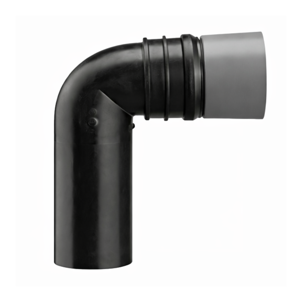 Cot de racordare perete-perete la 90°, destinat instalațiilor de evacuare, realizat din polietilenă de înaltă densitate (PE-HD), cu posibilitate de sudare sau de introducere în altă conductă de scurgere. Piesa este prevăzută cu garnitură dublă de etanșare, pentru asigurarea unei îmbinări sigure și durabile în exploatare. Varianta corespunzătoare codului 3917 este reglabilă în 3 direcții, permițând adaptarea extinsă a poziției de montaj în funcție de configurația instalației sanitare. Execuția include protecție de șantier, utilă pentru protejarea zonei de racord în perioada lucrărilor. Materialul corpului este PE-HD sudabil, iar materialul de etanșare este EPDM, rezistent la îmbătrânire și la intemperii conform DIN EN 681-1. Componenta este testată conform DIN 1389 și DIN EN 476 și este adecvată pentru variații de temperatură de până la +95 °C. Culoare: negru.