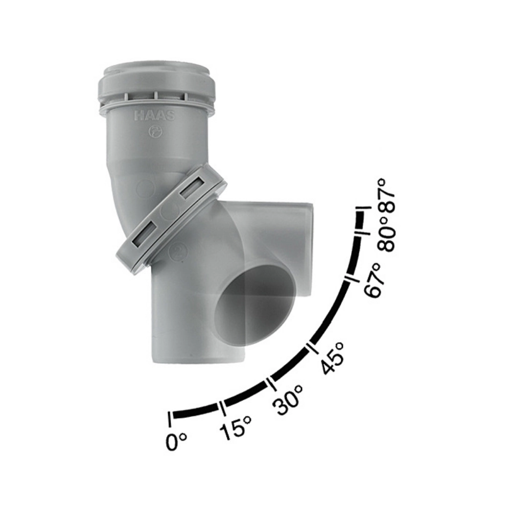 Cot reglabil OHA Multi-Bow din polipropilenă PP, DN 50/50, destinat instalațiilor de evacuare HT. Permite reglaj infinit al unghiului între 0° și 87°, eliminând necesitatea stocării multiplelor coturi fixe convenționale. Sistemul special de alunecare și etanșare asigură o conexiune rapidă, sigură și etanșă în orice poziție, prevenind tensiunile din îmbinări și riscul de scurgeri. Ideal pentru spații înguste, racorduri oblice și derivații complexe, contribuind la economisirea timpului și spațiului pe șantier și la depozitare.