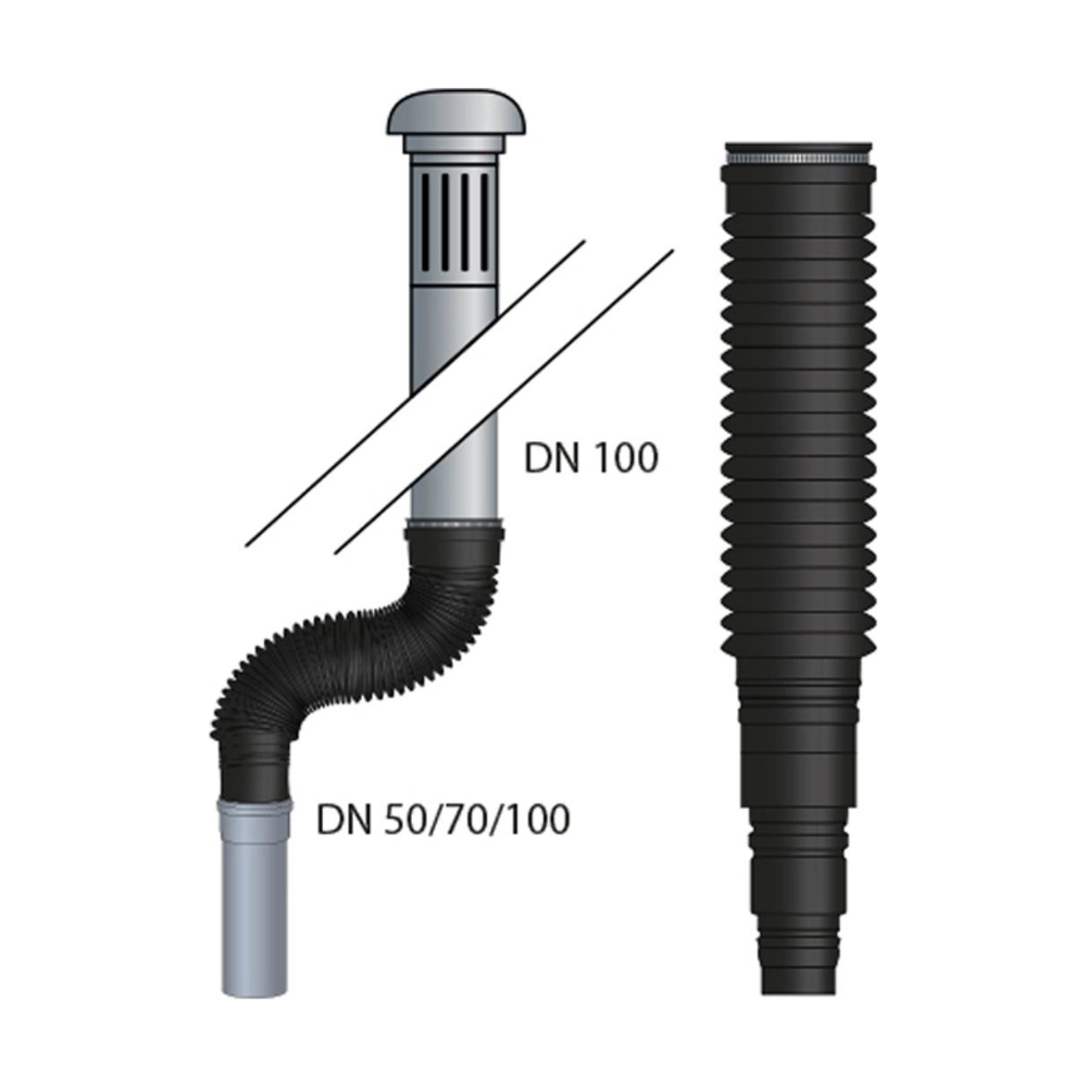 Pe partea capotei de acoperiș, furtunul se racordează la DN 100, iar pe partea coloanei de aerisire permite conectarea la DN 50, DN 70 sau DN 100, făcând posibilă adaptarea la diferite diametre de conductă fără utilizarea unui număr mare de fitinguri rigide. Geometria flexibilă permite compensarea diferențelor de ax și a abaterilor de la verticală până la aproximativ 45°, ceea ce reduce solicitările mecanice în zona trecerii prin acoperiș și minimizează riscul de apariție a eforturilor nedorite în rețea.