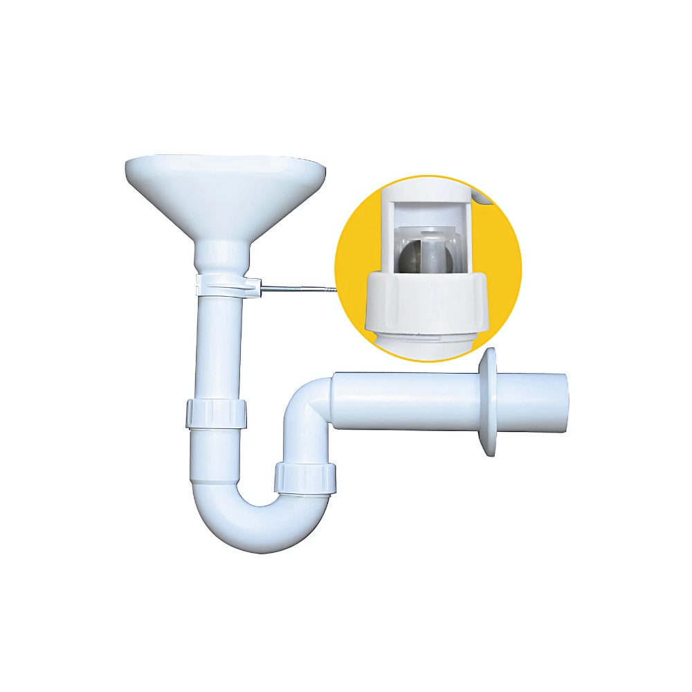 Sifon de pâlnie cu închidere tip bilă, destinat lavoarelor și chiuvetelor, realizat din polipropilenă rezistentă. Sistemul ingenios de închidere cu bilă previne uscarea sifonului în perioadele lungi de neutilizare și permite curățarea facilă. Racord de intrare 1½", diametru nominal DN 50, potrivit pentru conducte Ø 50 mm. Produsul este livrat complet cu garnituri de etanșare și accesorii.