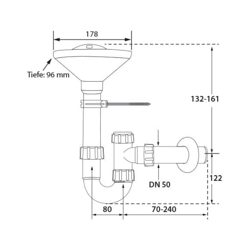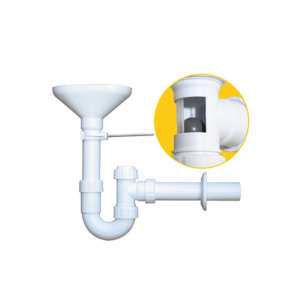 Sifon de pâlnie pentru chiuvete și lavoare, realizat din polipropilenă rezistentă, prevăzut cu sistem de închidere tip bilă și orificiu de curățare integrat. Mecanismul cu bilă previne uscarea sifonului în perioadele lungi de neutilizare și facilitează întreținerea igienică. Racord de intrare 1½", diametre nominale compatibile DN 40, DN 50 și DN 56. Produsul se livrează complet cu garnituri de etanșare și accesorii necesare montajului.