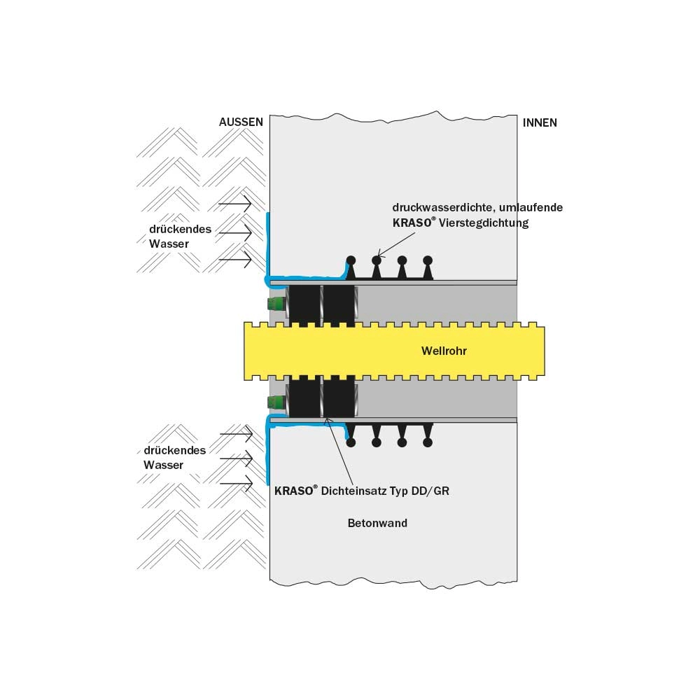 Certificări și performanță: Inelul este testat de MPA și oferă protecție împotriva apei sub presiune de 1 bar sau 2 bar. În plus, este complet etanș împotriva gazelor și mirosurilor, conform standardelor TA-Luft.