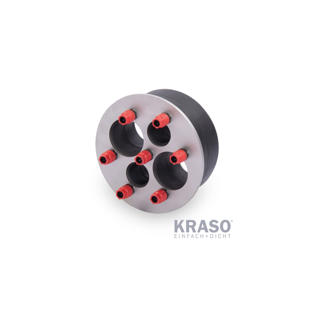 nel de etanșare pentru conducte sau cabluri, cu piuliță de control al cuplului KRASO DKM, plăci de prindere din oțel inoxidabil V2A, grosime 5 mm, și garnitură din cauciuc special de 60 mm. Rezistent la apă (până la 2,5 / 5 bar), gaze, mirosuri și radon.