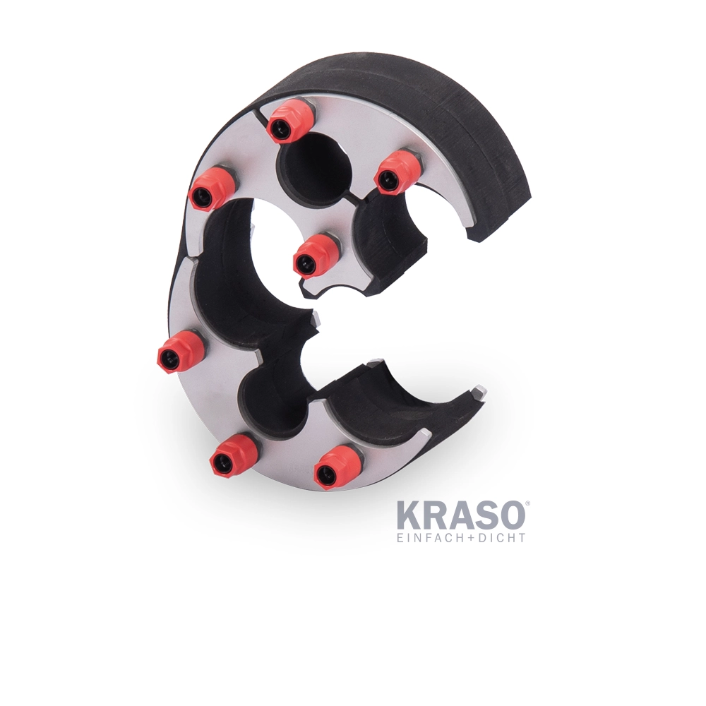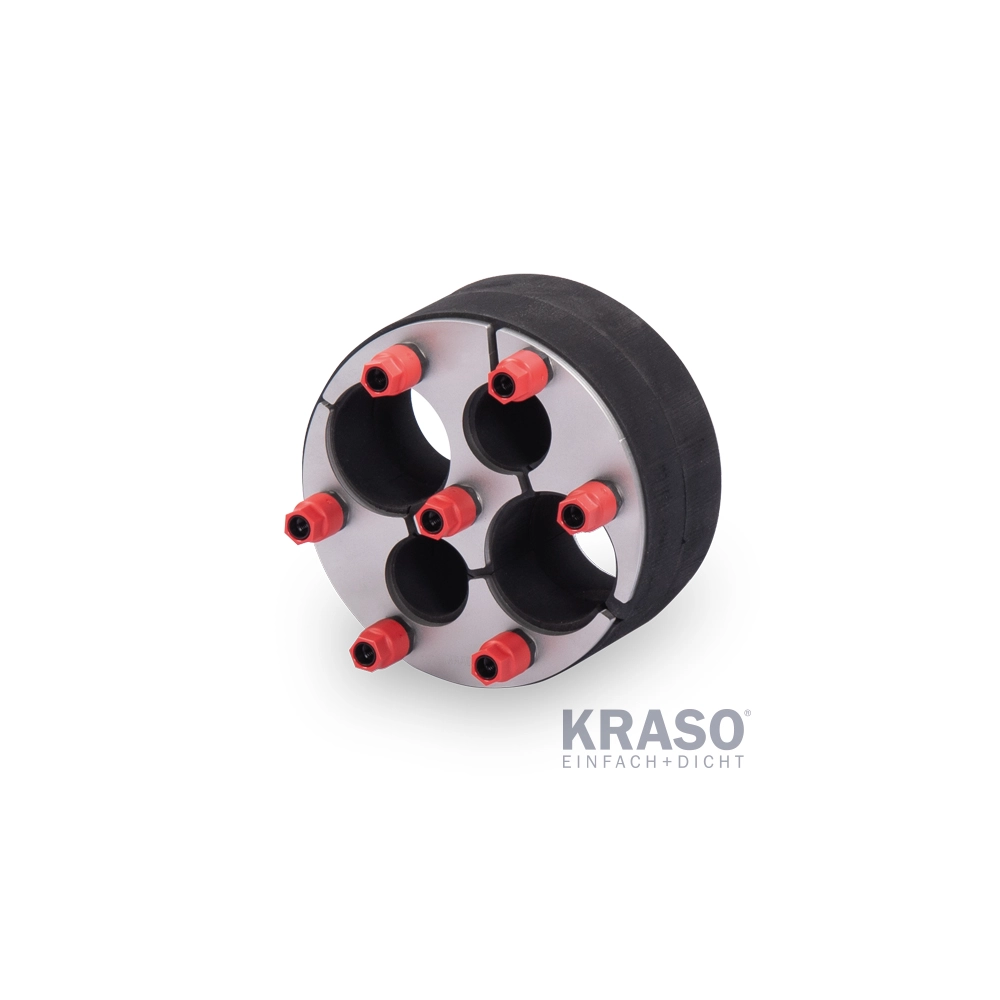 nel de etanșare pentru conducte sau cabluri, cu piuliță de control al cuplului KRASO DKM, plăci de prindere din oțel inoxidabil V2A, grosime 5 mm, și garnitură din cauciuc special de 60 mm. Rezistent la apă (până la 2,5 / 5 bar), gaze, mirosuri și radon.