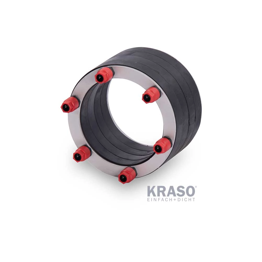 Inelul de etanșare este prevăzut cu plăci de fixare de 5 mm grosime din oțel inoxidabil V2A și include o garnitură de cauciuc de înaltă calitate. Știfturile sudate sunt utilizate în locul șuruburilor de trecere pentru o distribuire mai uniformă a presiunii. Piulița de control al cuplului KRASO DKM este dotată cu un limitator de cuplu integrat, eliminând necesitatea unei chei dinamometrice. Inelul este testat pentru etanșeitate la gaze conform DIN EN 13611 (capitolul 7.12) și certificat de centrul de cercetare DVGW de la Institutul Engler-Bunte din Karlsruhe. De asemenea, este testat MPA și protejează eficient împotriva apei sub presiune până la 10 bar, fiind etanș la gaze și mirosuri, conform TA-Air. De asemenea, îndeplinește cerințele pentru zonele de precauție radon conform FHRK și este certificat cu sigiliul de calitate FHRK e.V.