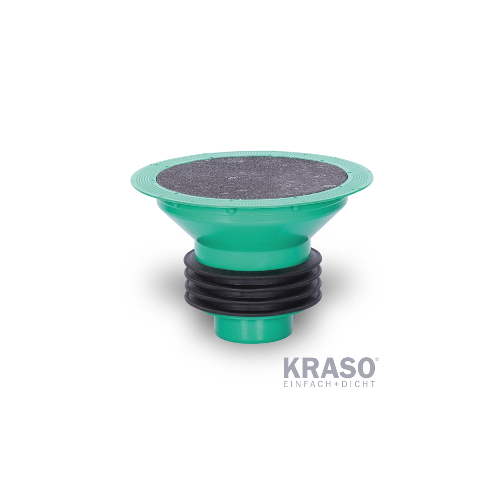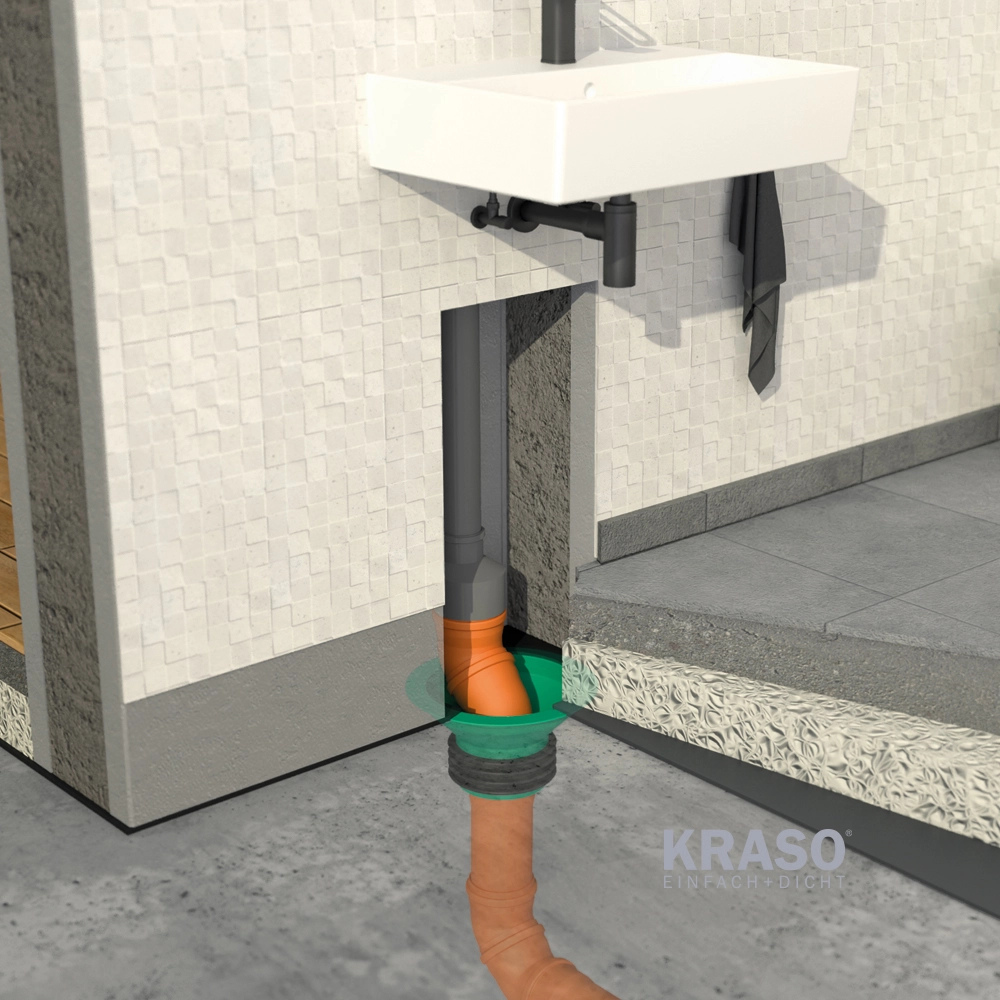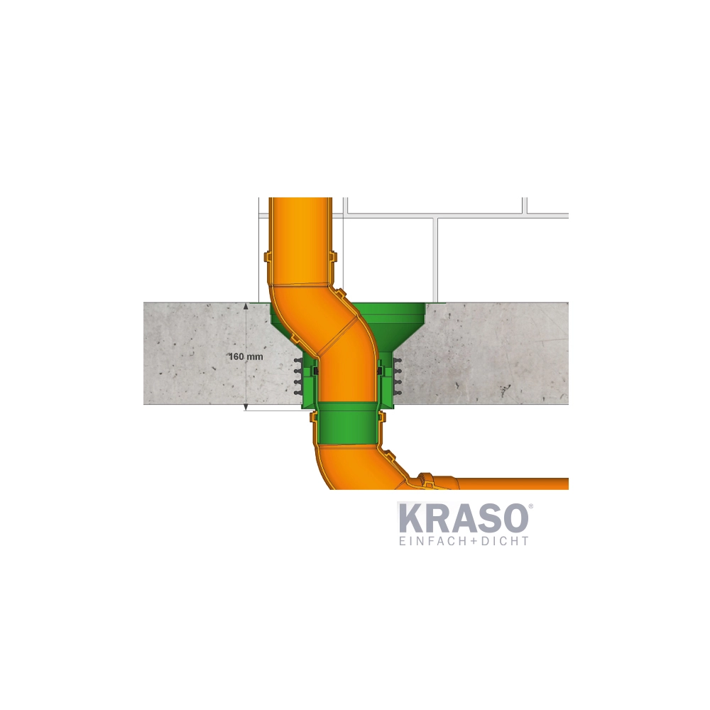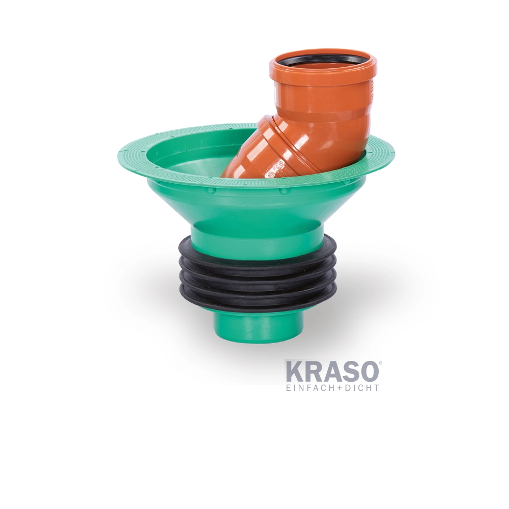 Pâlnia universală pentru trecere prin placă este proiectată pentru plăci de fundare din beton impermeabil (WU), asigurând un racord sigur și etanș între rețeaua de canalizare/evacuare și structura clădirii. Etanșarea perimetrală este realizată cu o garnitură KRASO® cu patru nervuri din TPE, sudată termic pe circumferință, care asigură etanșeitate la apă sub presiune până la 7 bar și tolerează mișcări diferențiale și dilatări ale elementelor de construcție. Capătul spigot permite integrarea directă în sistemele KG/HT, respectiv racordarea la conducte de bază KG/KG2000, inclusiv în situații cu ușor decalaj (versatz).