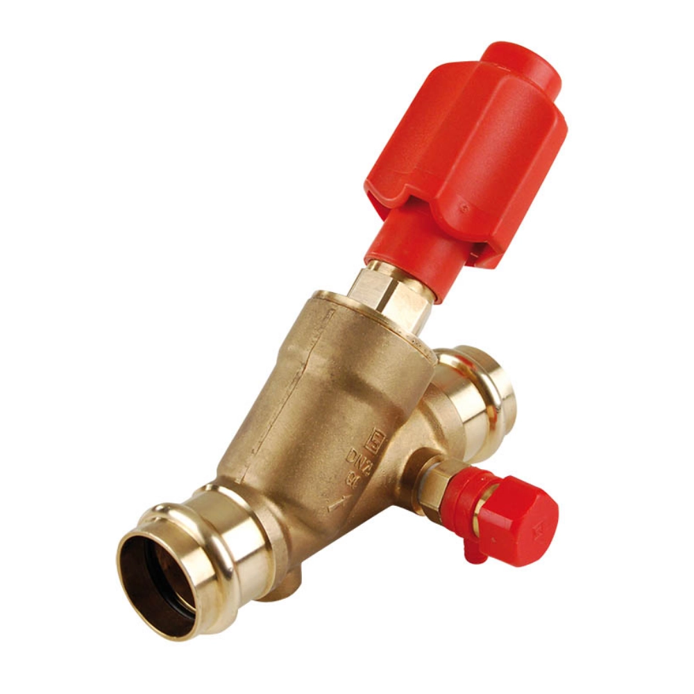 Robinet cu sertar înclinat cu cap SEPP Servo-Plus, ax fix, prevăzut cu golire pivotantă, cameră de ungere și indicator de poziție. Conexiune prin presare universală SPS (M/V), pentru țevi din cupru, inox și oțel-carbon. Etanșare dublă cu O-ring, testat fonic conform DIN 4109 (Grupa I până la DN32).
