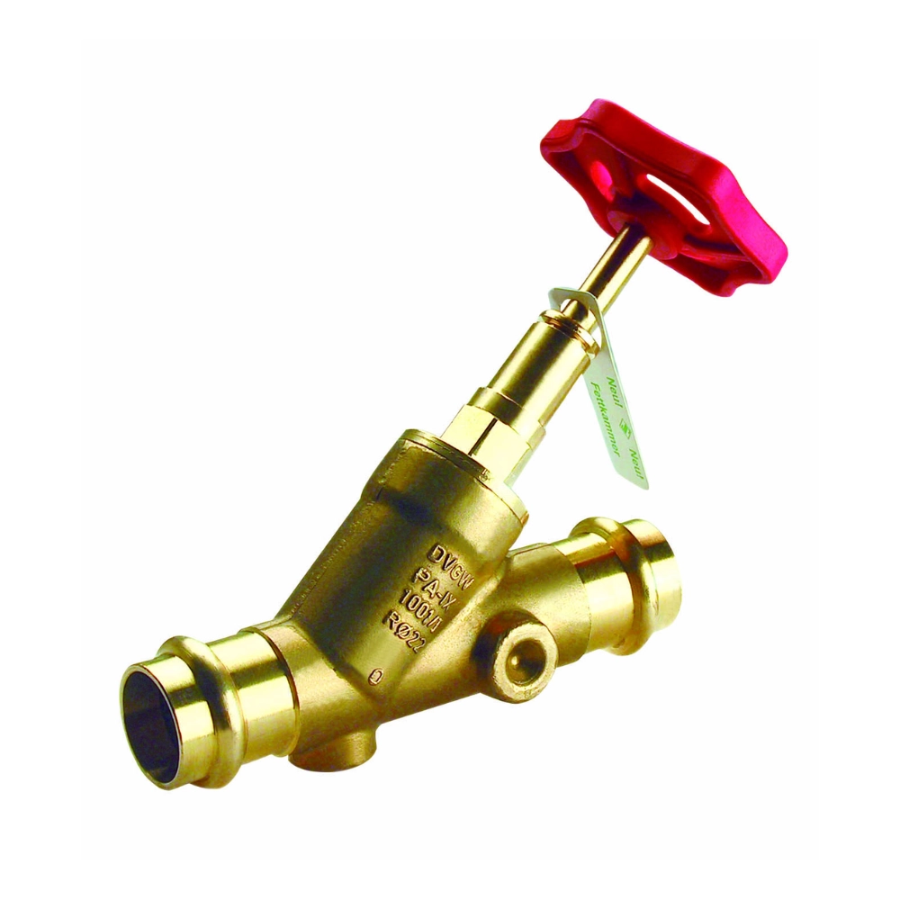 Robinet cu sertar înclinat cu cap SEPP Servo cu ax ascendent, fără racord de golire, echipat cu cameră de ungere și etanșare dublă O-ring. Racorduri presare universale SPS (M/V) pentru țevi din cupru conform DIN EN 1057, inox (GW541) și oțel-carbon (EN 10305-3). Testat fonic conform DIN 4109 (Grupa I până la DN32).