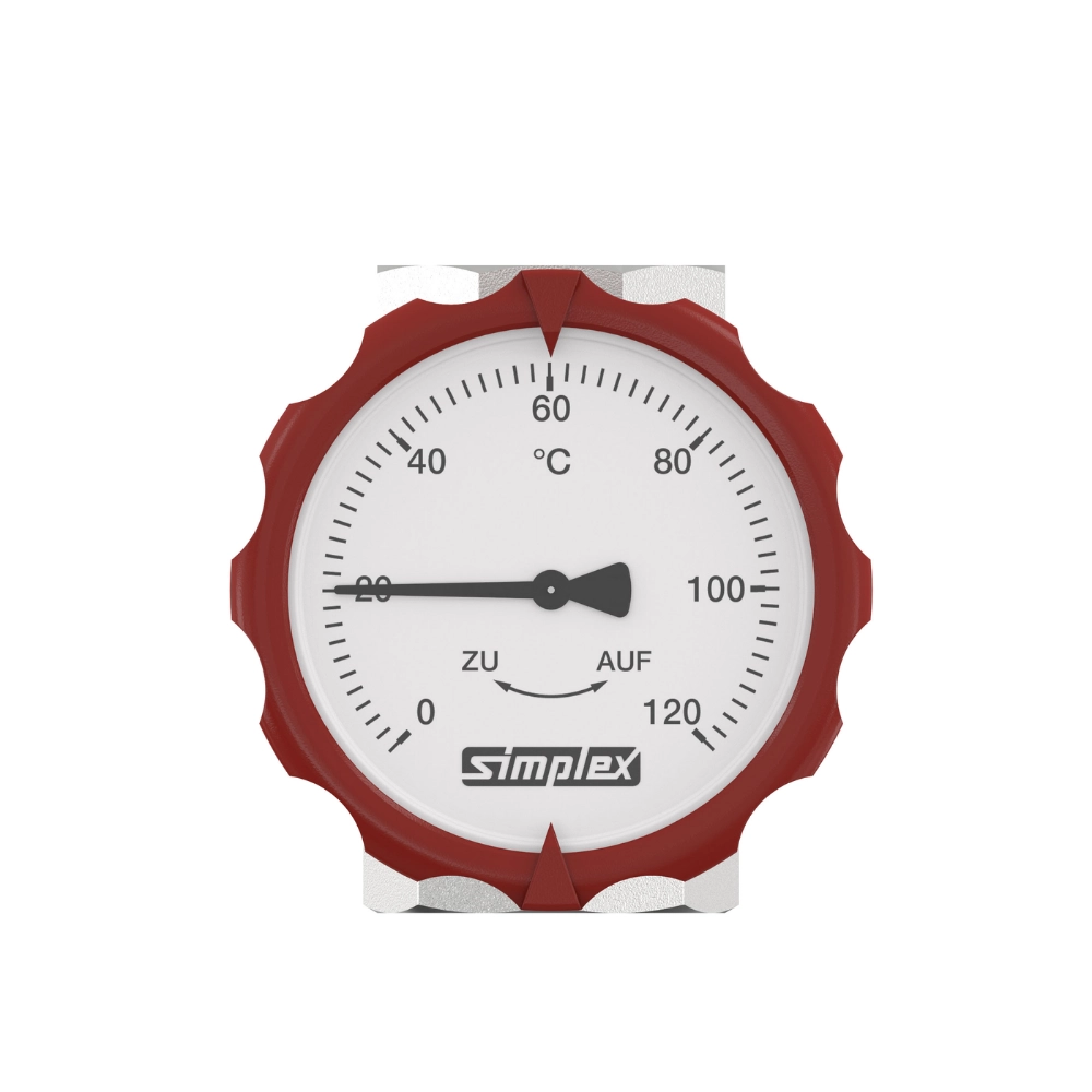 Mâner special cu termometru Ø 63 mm încorporat, proiectat pentru robineții sferici Simplex (DN 20–50, cu excepția F10121). Datorită axului tubular al robineților, permite montarea facilă fără unelte. Toate tipurile de mâner sunt interschimbabile. Corp metalic, mâner din plastic rezistent. Disponibil în culorile roșu și albastru. Produs livrat individual, personalizabil la cerere cu logo.