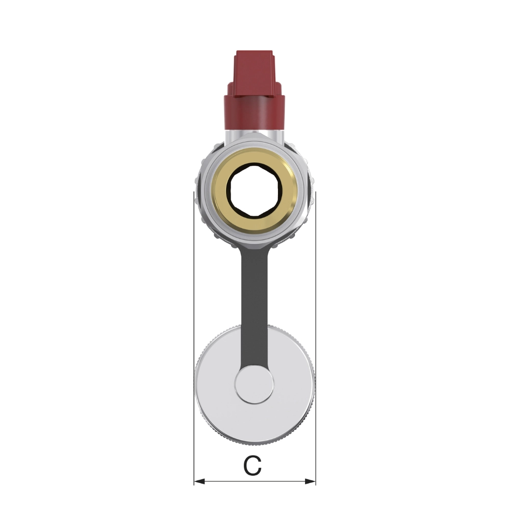 Robinet KFE-KH DN20 - D SV, versiune dreaptă cu supapă de siguranță, destinat sistemelor de încălzire. Filet autosealing, capac de protecție funcțional ca rotiță manuală, construcție solidă cu bilă în teflon și garnituri EPDM. Corp și racord din alamă nichelată, fără substanțe care afectează vopsirea. Nu este potrivit pentru apă potabilă sau aplicații solare. Dimensiuni (mm): A=73, B=60, C=37, F=42.5, G=11, H=50, I=32, K=35, L=20.