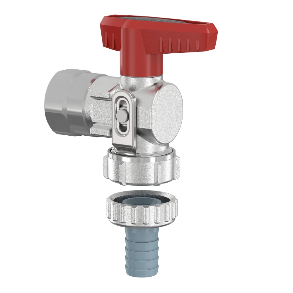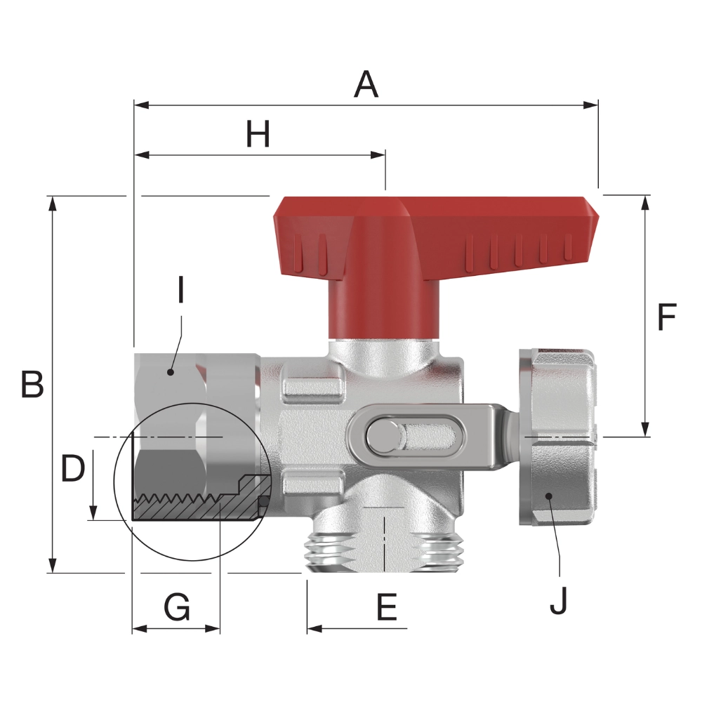 Robinet KFE-KH F - E SV cu supapă de siguranță, versiune unghiulară, pentru sisteme de încălzire. Construcție solidă cu corp din alamă nichelată, bilă PTFE, garnituri EPDM, brachet din oțel inoxidabil. Prevăzut cu filet interior Rp 1/2'' la intrare și racord furtun G 3/4'' M la ieșire. Filet autosealing și capac de protecție funcțional ca rotiță manuală. Nu este potrivit pentru apă potabilă sau aplicații solare. Dimensiuni (mm): A=76, B=61.0, C=31.0, F=40, G=12, H=40.5, I=27, J=30, K=33, L=14.5.