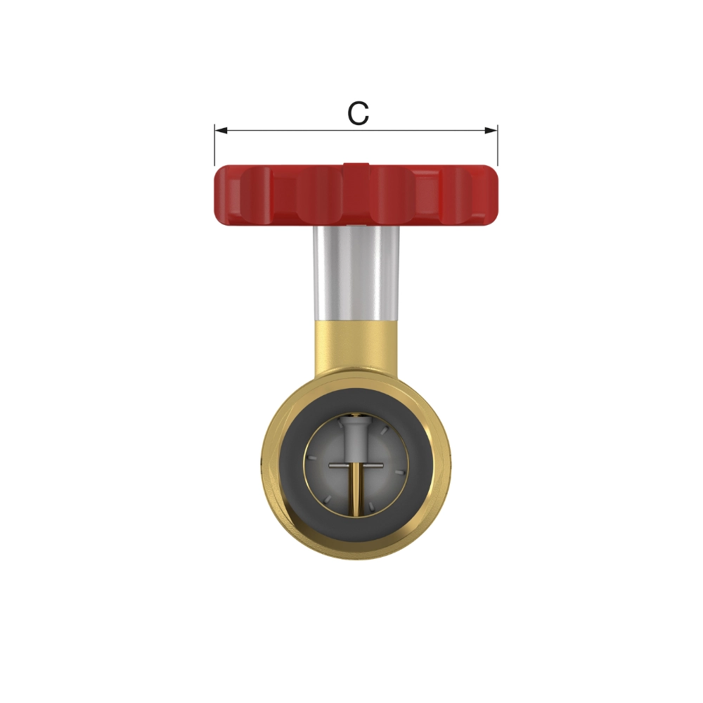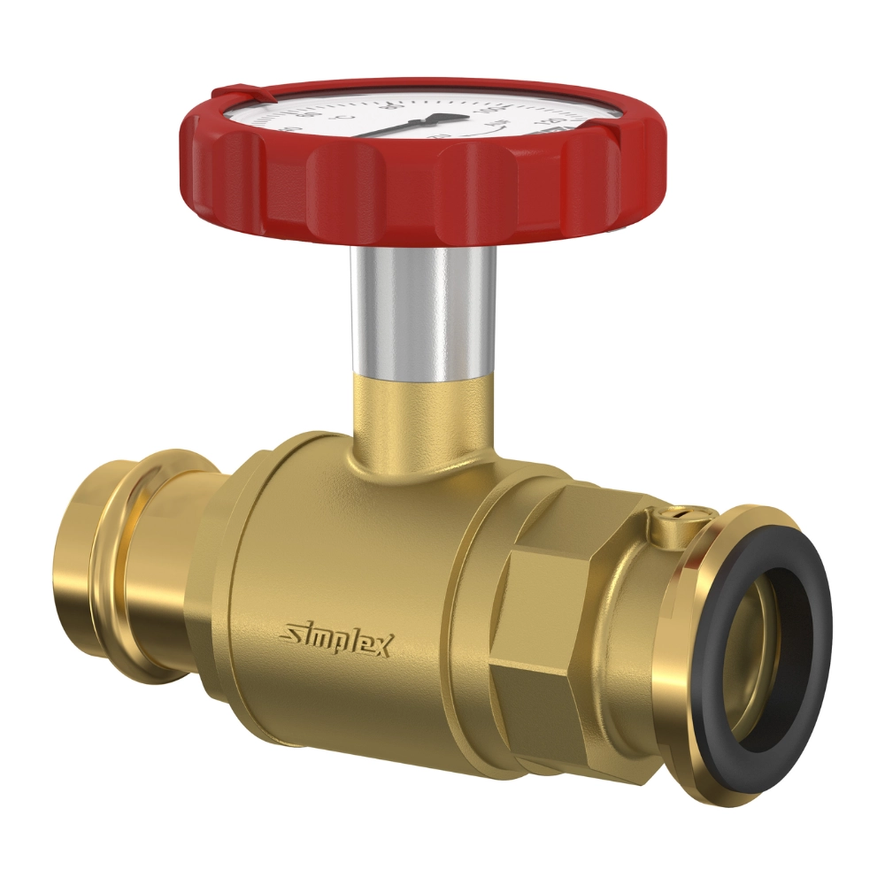 Robinet sferic cu conexiune presare pentru țevi din cupru, oțel carbon și inox, utilizat pe partea de refulare a pompelor de circulație. Include mâner rotund roșu cu termometru Ø 63 mm integrat, limitator de retur și dispozitiv de deschidere. Nu acționează ca supapă de reținere. Tijă cu dublă etanșare O-ring. Recomandare: acționare periodică pentru prevenirea blocajului. Conexiune presare cu profil M și V, compatibilă cu țevi metalice. Fabricat conform VDI 2035, PN 16.