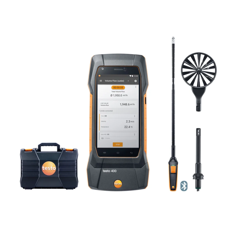 Instrumentul testo 400: Un instrument de măsurare universal cu meniuri intuitive pentru viteza aerului, temperatura, umiditatea și debitul volumic. Acesta vine echipat cu un senzor de presiune diferențială integrat.