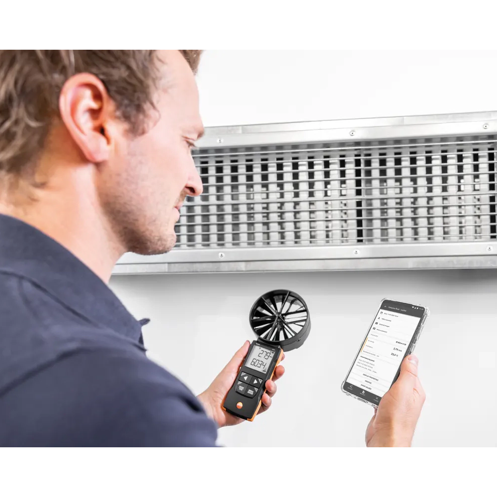 Conectivitate la aplicația testo Smart App: Configurarea anemometrului este rapidă prin aplicația testo Smart App, care oferă un istoric grafic al măsurărilor, al doilea ecran pentru vizualizarea în timp real a valorilor și memorie pentru stocarea datelor de măsurare.