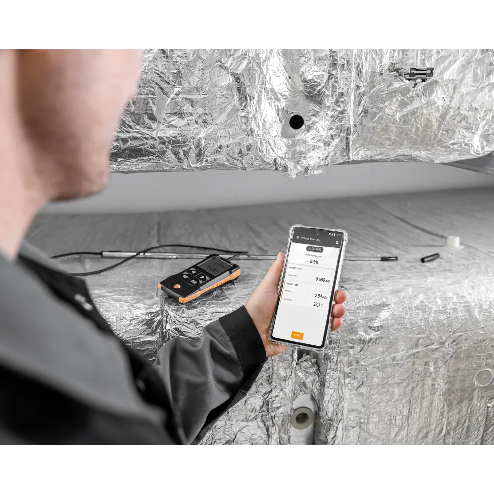 Conexiune la aplicația testo Smart App: Permite configurarea rapidă, vizualizarea graficelor, salvarea datelor și documentarea rezultatelor direct în aplicație. Telefonul poate fi utilizat și ca al doilea ecran pentru a facilita măsurătorile.