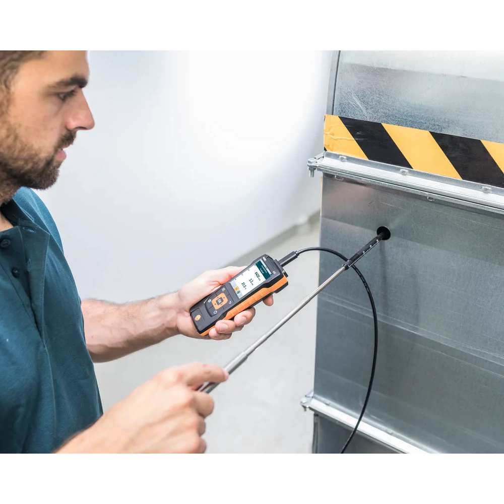 Set pentru măsurători precise în conductele de ventilație: Setul include instrumentul testo 440 și sonda cu fir cald (Ø 9 mm), care este echipată cu un senzor de temperatură integrat, toate depozitate într-o geantă de transport convenabilă.