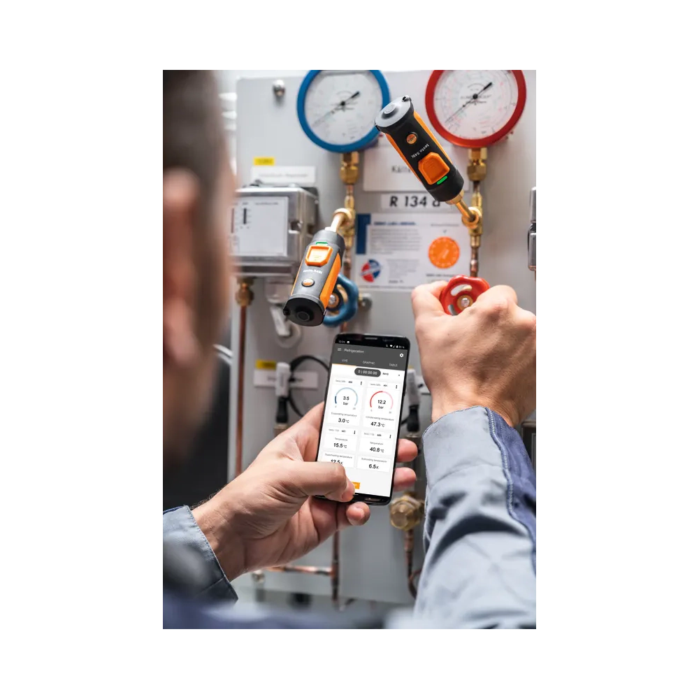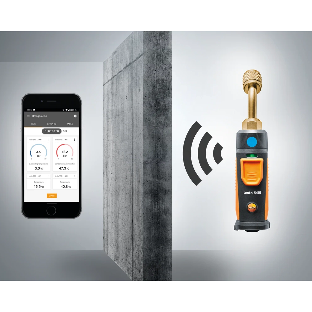 Conexiune wireless Bluetooth®: Sonda se conectează fără probleme la un smartphone sau tabletă prin Bluetooth®, cu o rază de acțiune de până la 100 m. Aceasta permite tehnicienilor să măsoare presiunea la puncte de măsurare aflate la distanțe mari, fără a fi nevoie de conectarea prin furtunuri, reducând astfel riscul de pierderi de agent frigorific.
