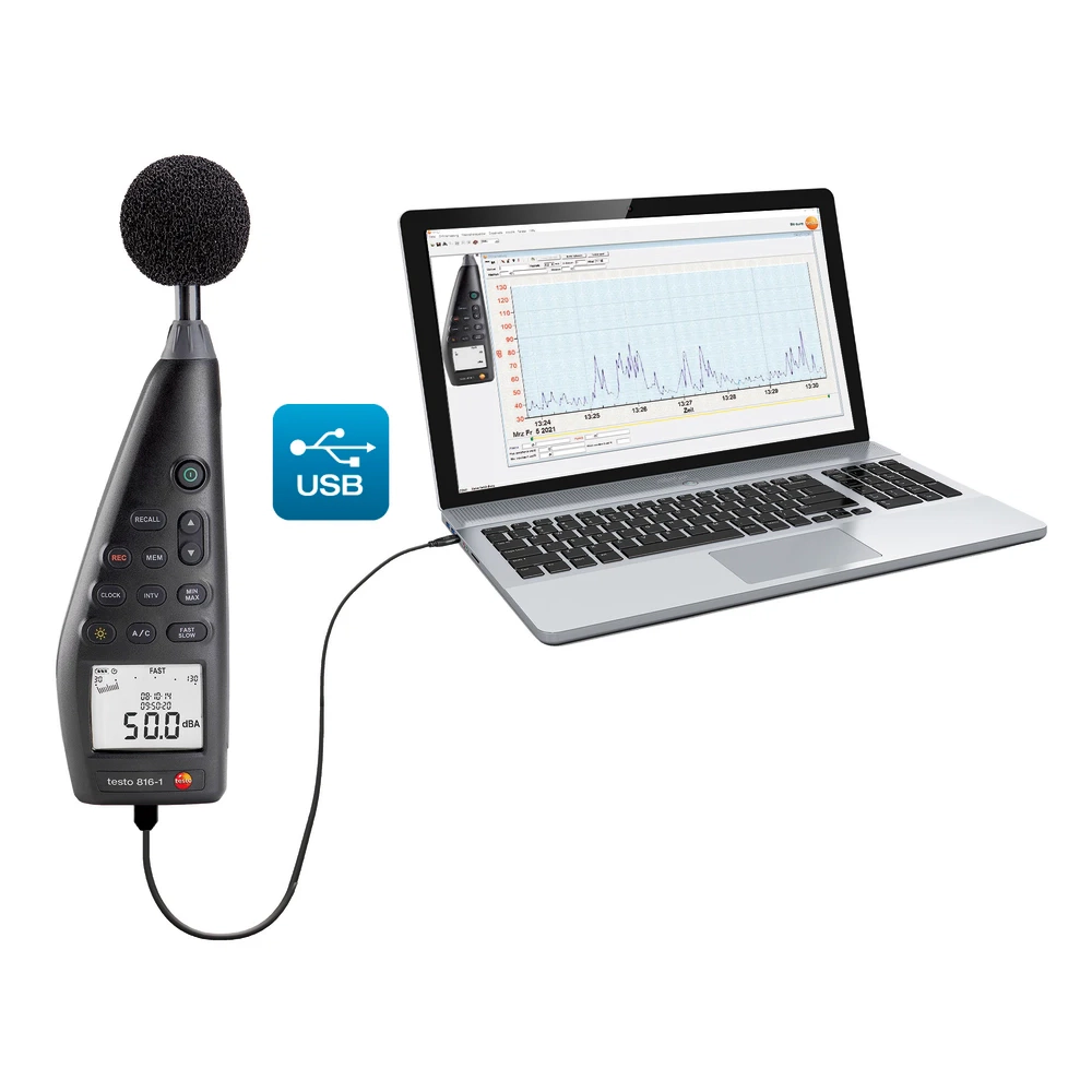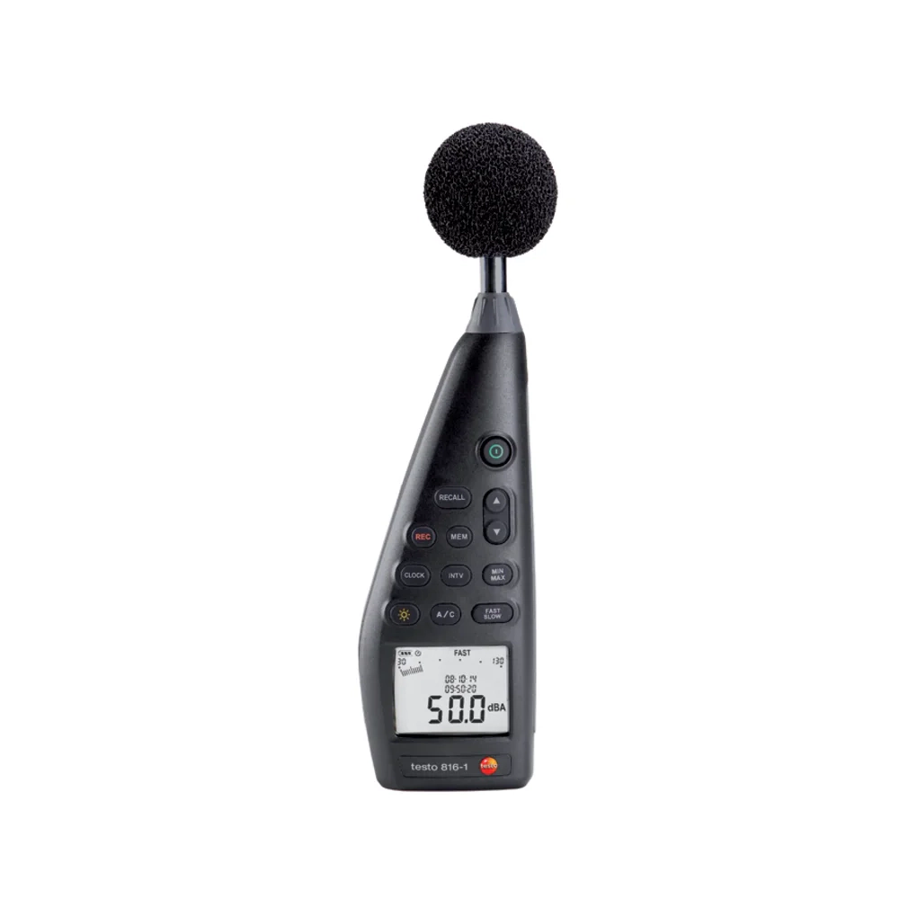 Conformitate cu standardele internaționale: Testo 816-1 este conform cu IEC 61672-1 Clasa 2 și ANSI S1.4 Tip 2, asigurând măsurători precise și fiabile ale nivelului de zgomot.