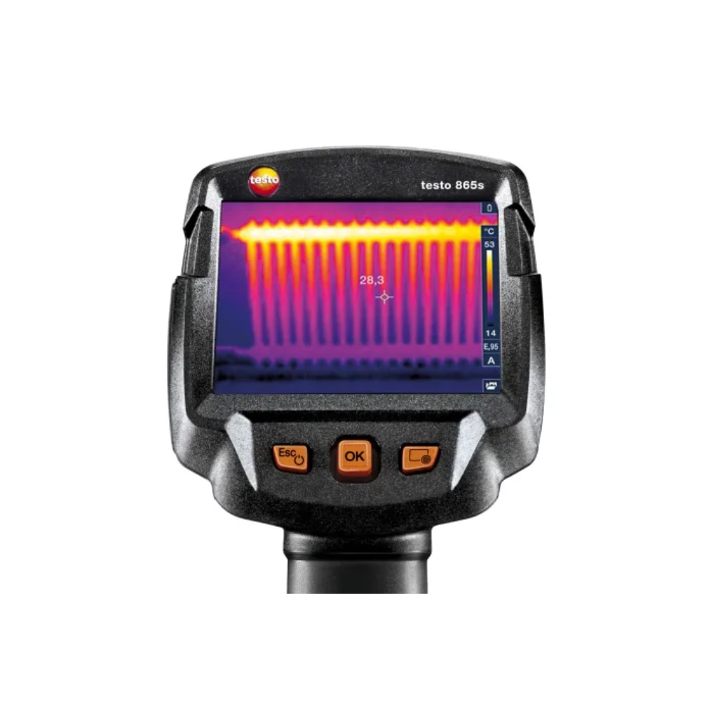 Camera de termoviziune testo 865s oferă imagini IR de înaltă calitate și operare intuitivă, fiind optimizată pentru diagnostic rapid în instalații, mentenanță și termografia clădirilor. Funcțiile ScaleAssist și IFOV-Warner asigură măsurări corecte, iar SuperResolution crește detaliul la 320×240 px.
