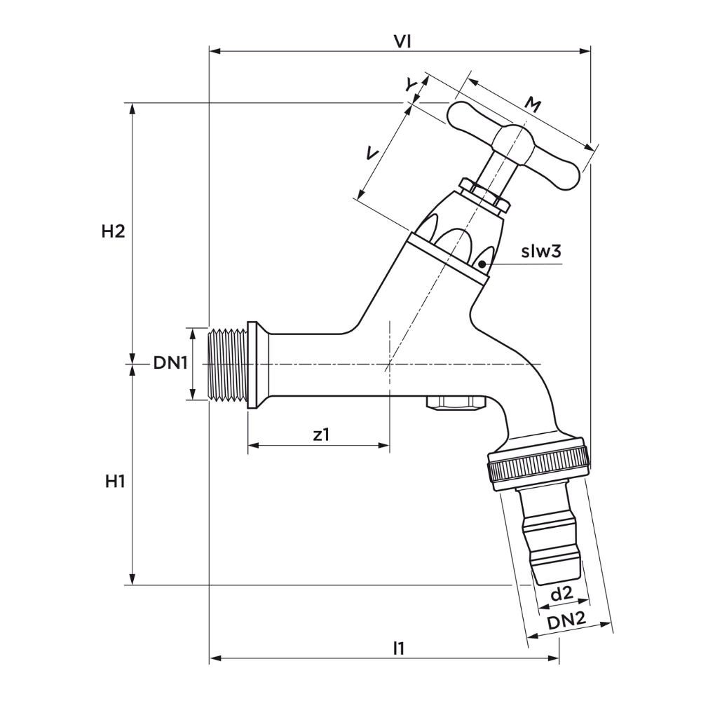- G1/2"x1/2" (DN15): 108x45x143 mm, d1 = 21.3 mm, l1 = 103 mm, z1 = 41 mm, d2 = 14.5 mm, DN2 = DN20, H1 = 65 mm, H2 = 78 mm, M = 45 mm, Y = 8 mm, V = 30 mm