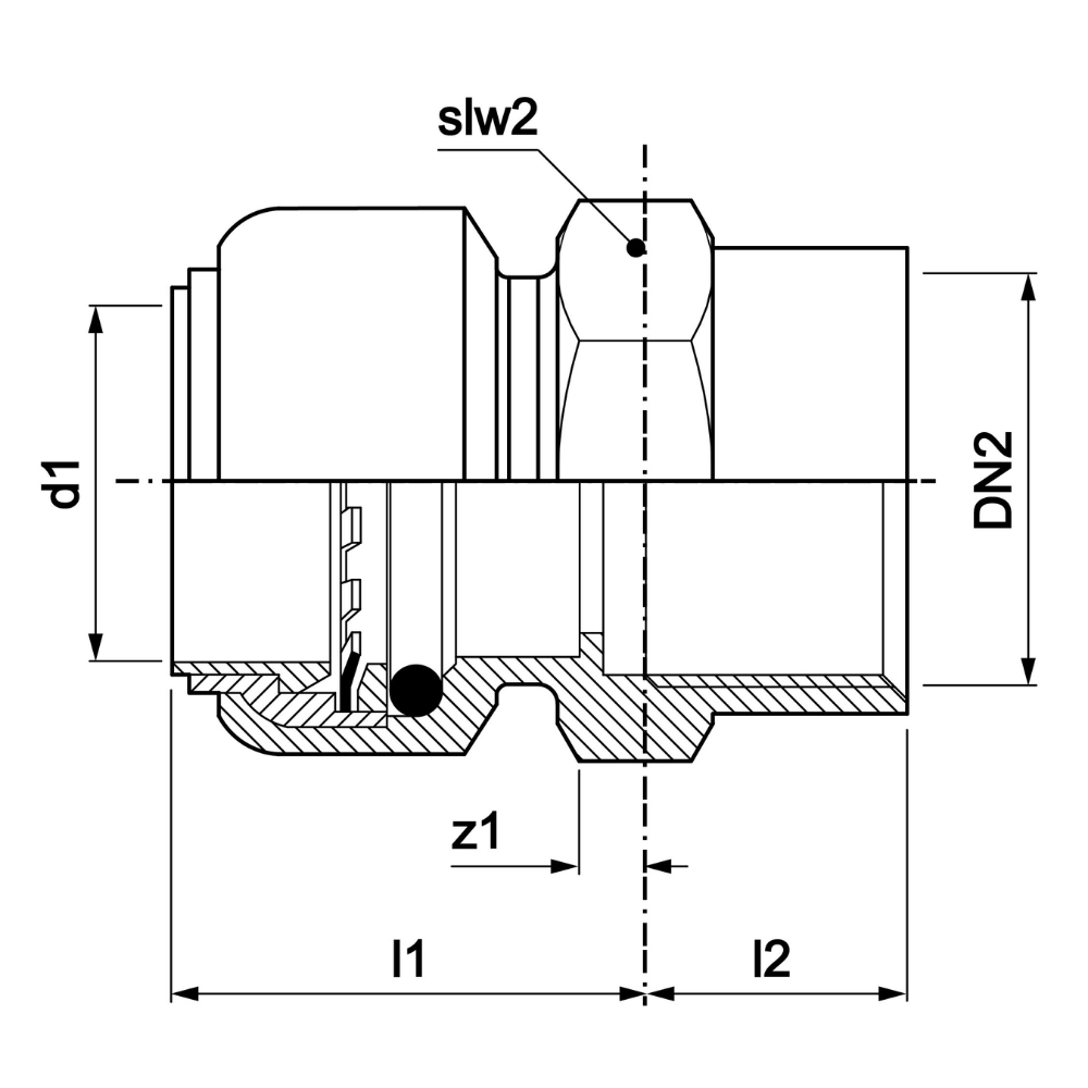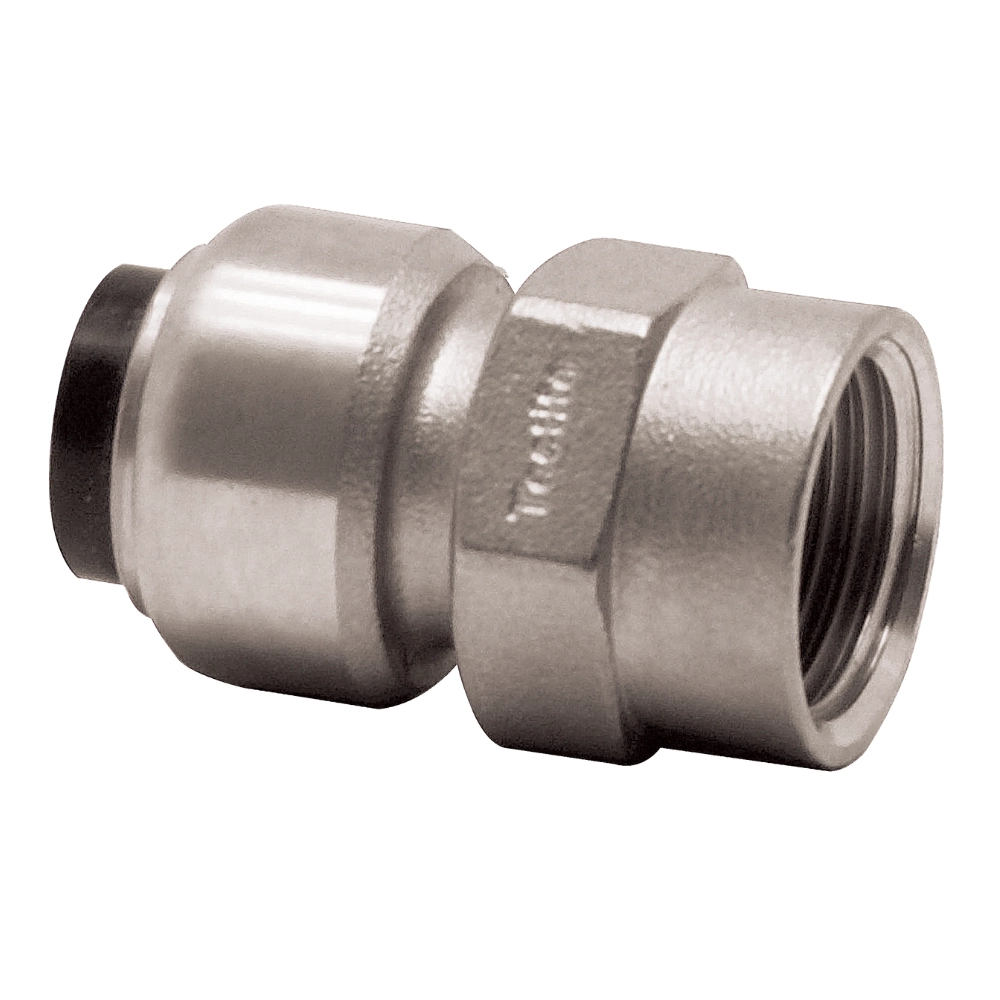 Cot drept de racordare, cu un capăt push-fit și un capăt filetat interior paralel (BSPP), realizat din oțel inoxidabil 316L (1.4404). Etanșare cu inel EPDM, montaj fără sudură, demontabil, cu continuitate electrică. Adecvat pentru instalații de apă potabilă, încălzire și răcire, în aplicații comerciale și industriale. Aprobat conform BSI Kitemark, DVGW, KIWA, CSN, WRAS, UK Reg. 4. Presiune: până la 20 bar, temperatură: -24…114 °C.