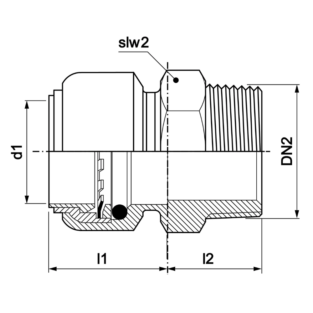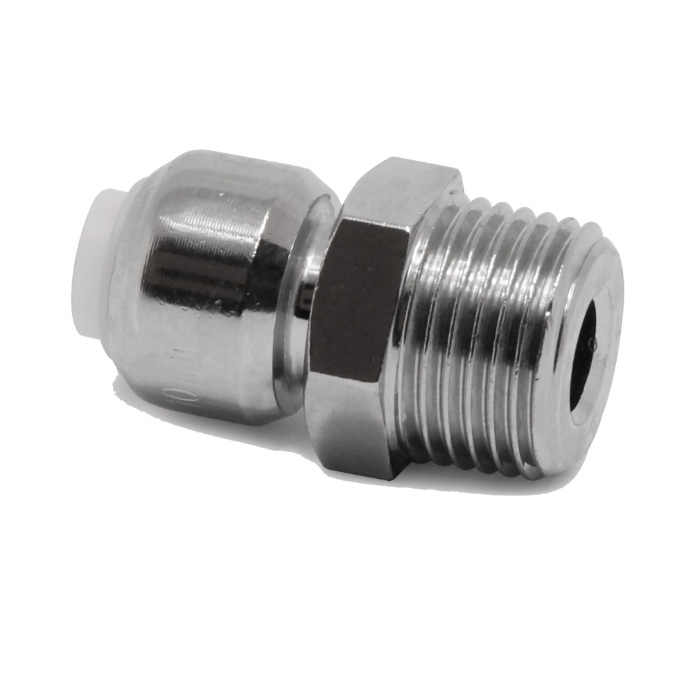 Racord drept cromat cu conexiune push x filet exterior conic (BSPT), din seria VSH Tectite Classic. Realizat din alamă CW602N cromată, cu garnitură EPDM. Utilizat în sisteme de apă potabilă și încălzire, în domeniul rezidențial și comercial. Presiune de lucru 16 bar, temperatură între -24°C și +95°C.