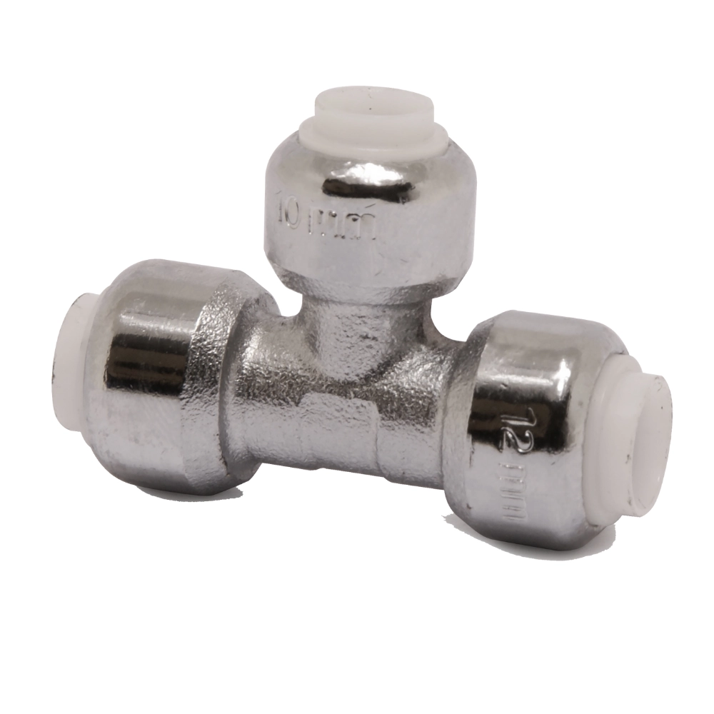 Teul cromat cu reducere dublă VSH Tectite – T27CP este un fiting profesional cu 3 conexiuni push, dintre care două sunt reduse. Este fabricat din alamă DZR cu finisaj cromat, etanșat cu garnitură EPDM și se montează rapid fără unelte. Demontabil, certificat pentru aplicații în instalații sanitare și termice. Presiune lichid max. 16 bar, domeniu termic: -24°C până la 95°C.