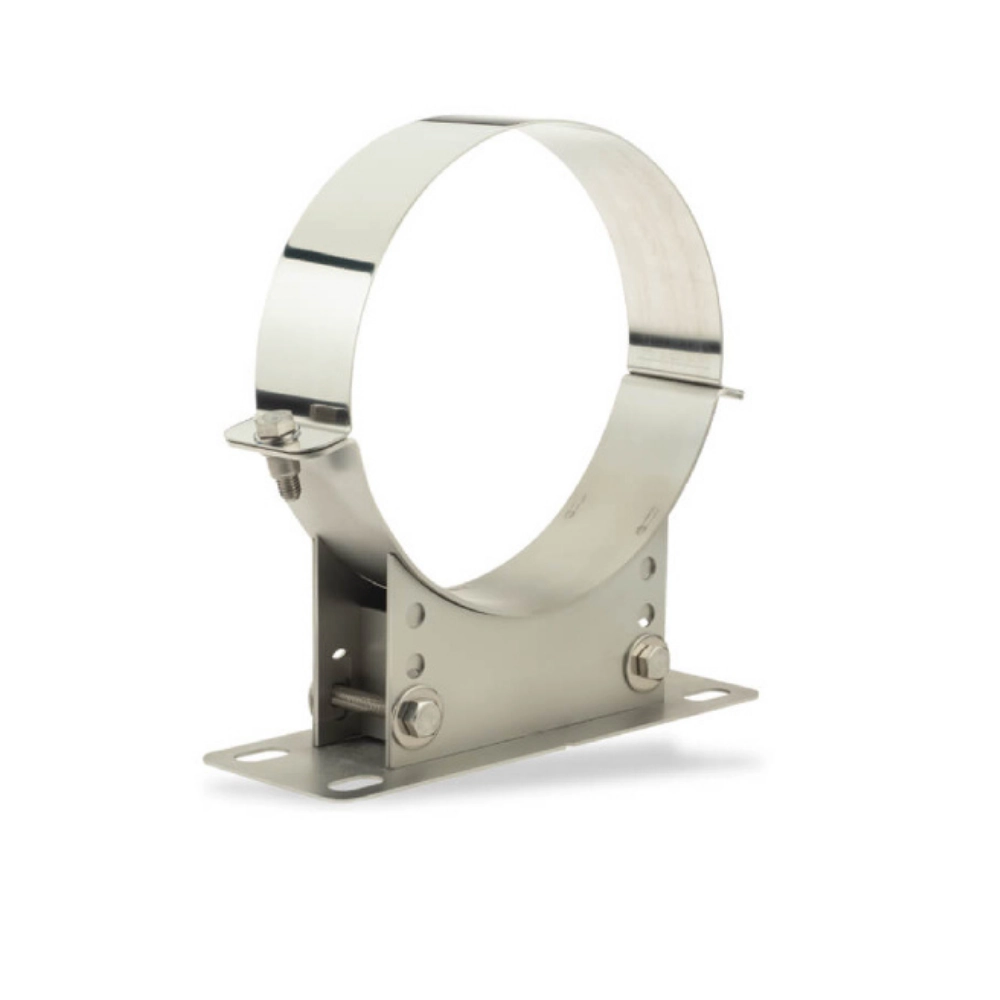 Suport de perete, fabricat din oțel inoxidabil, utilizat pentru fixarea coloanelor pe fațadă. Diametru: 180 mm, distanța de perete ajustabilă între 50 și 90 mm.