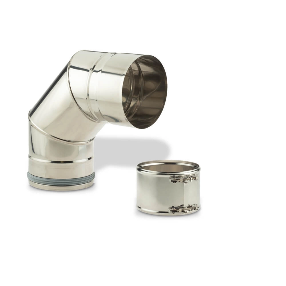Cot ComfoVent la 90°, fabricat din oțel inoxidabil, dotat cu garnitură și prindere cu clemă, cu diametrul D = 180 mm.