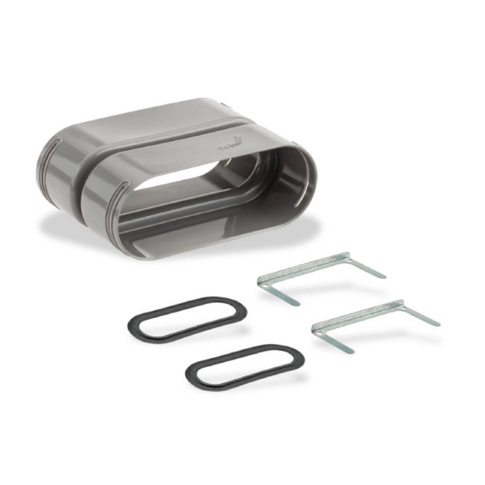 Manșon plat 51, conceput pentru o conexiune ușor de instalat cu ComfoTube, oferind o montare sigură și rapidă. Include o glisieră de blocare pentru fixare fermă și o garnitură O pentru etanșare optimă, asigurând o performanță fiabilă în sistemele de ventilație.