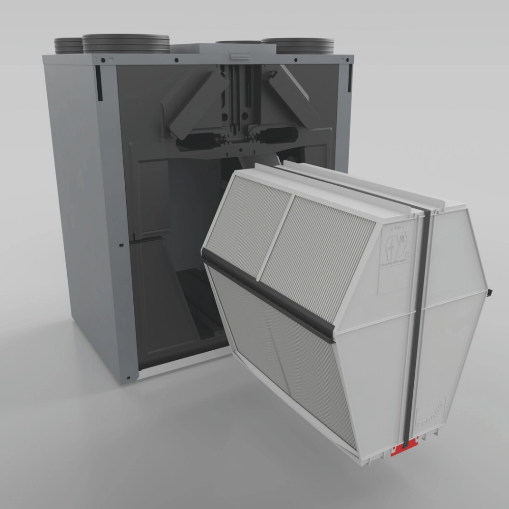 Enthalpy exchanger este un schimbător de căldură avansat, destinat recuperării simultane a umidității și căldurii din aerul evacuat, contribuind la economisirea de energie și menținerea unui climat interior confortabil. Acesta este compatibil cu o gamă variată de modele, inclusiv ComfoAir Q350/450/600, ComfoAir G90/G91/350, ComfoAir 160, ComfoAir 180, ComfoAir 200, ComfoAir 500/550, Novus 300/450 și Focus 200. Enthalpy exchanger-ul asigură o performanță excelentă, transferând eficient atât căldura, cât și umiditatea între fluxurile de aer, îmbunătățind eficiența energetică și confortul ambiental.
