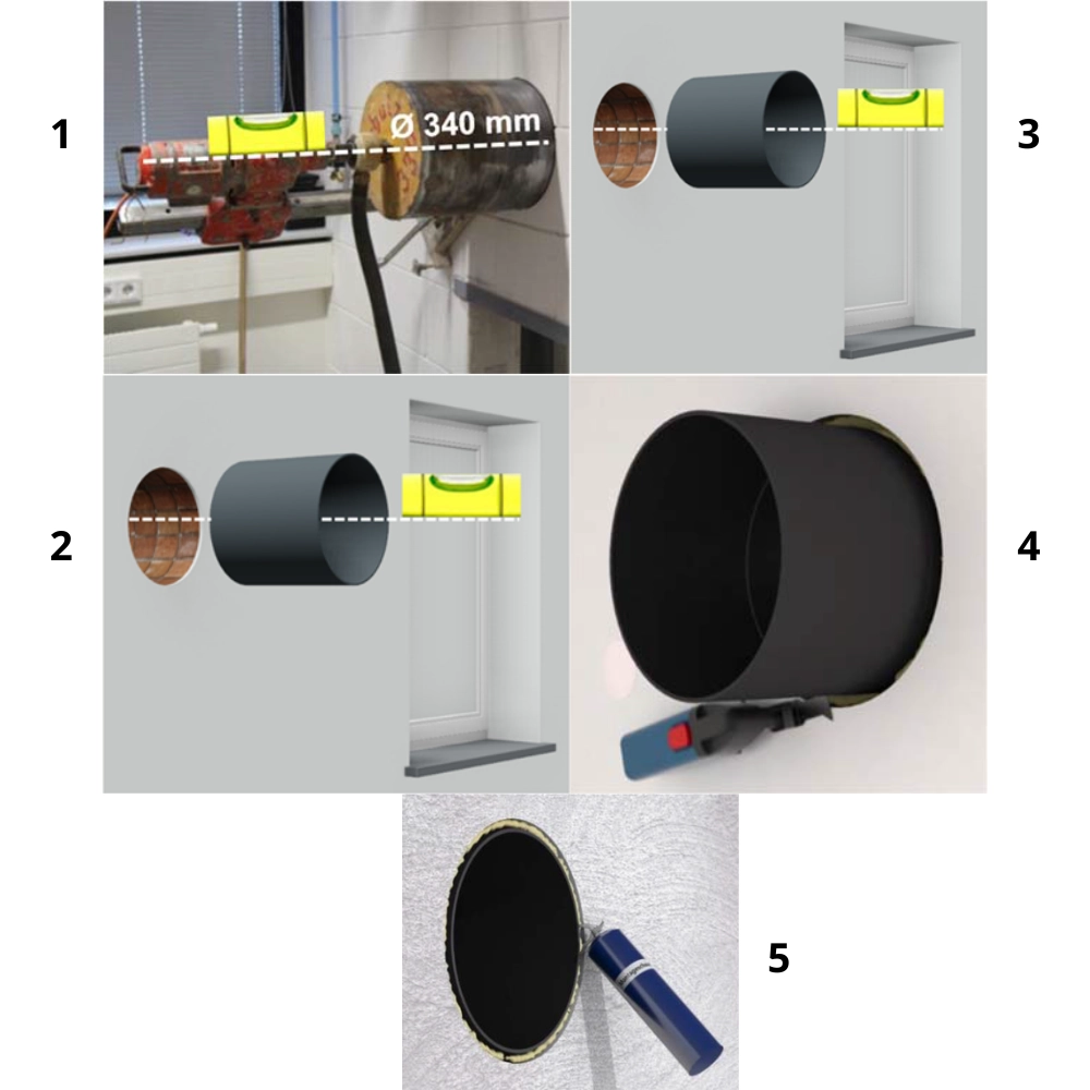 Soluție pentru montarea ComfoSpot 50 în pereți cu grosime de până la 900 mm. Permite utilizarea extensiei EPP pentru grosimi suplimentare. Asigură fixarea corectă a unității și continuitatea izolării termo-fonice.